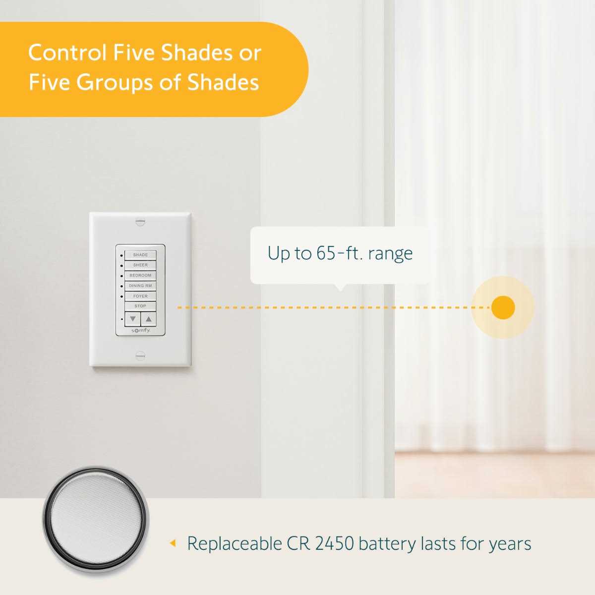 • Controls 5 Somfy RTS devices or 5 groups of devices