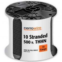 This Cerro black 500 ft. 10 gauge stranded THHN wire is UL and CSA listed for safety. Constructed of durable copper and jacketed with nylon for effective, safe performance. Wire is used in commercial and industrial applications as specified in the NEC.For indoor use30 allowable ampacities600 Volts maximumMarked THWN-2 on wire