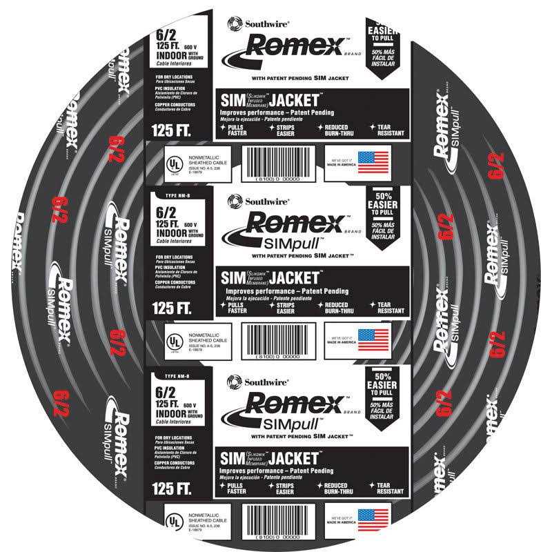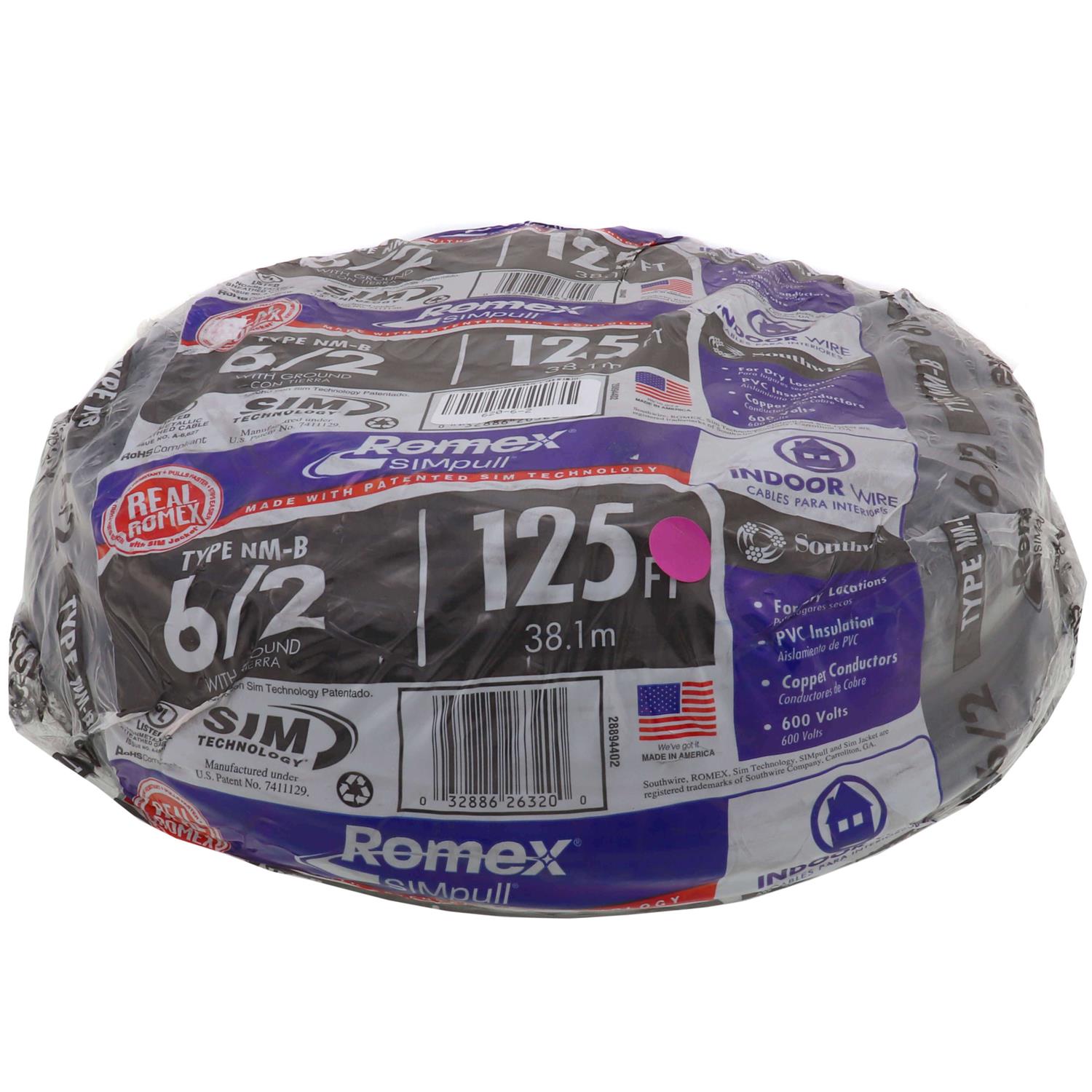 - Romex SIMpull Building Wire, Type NM-B, 6 AWG Conductor, 2 Conductors, Copper Conductor, 125 ft Length
