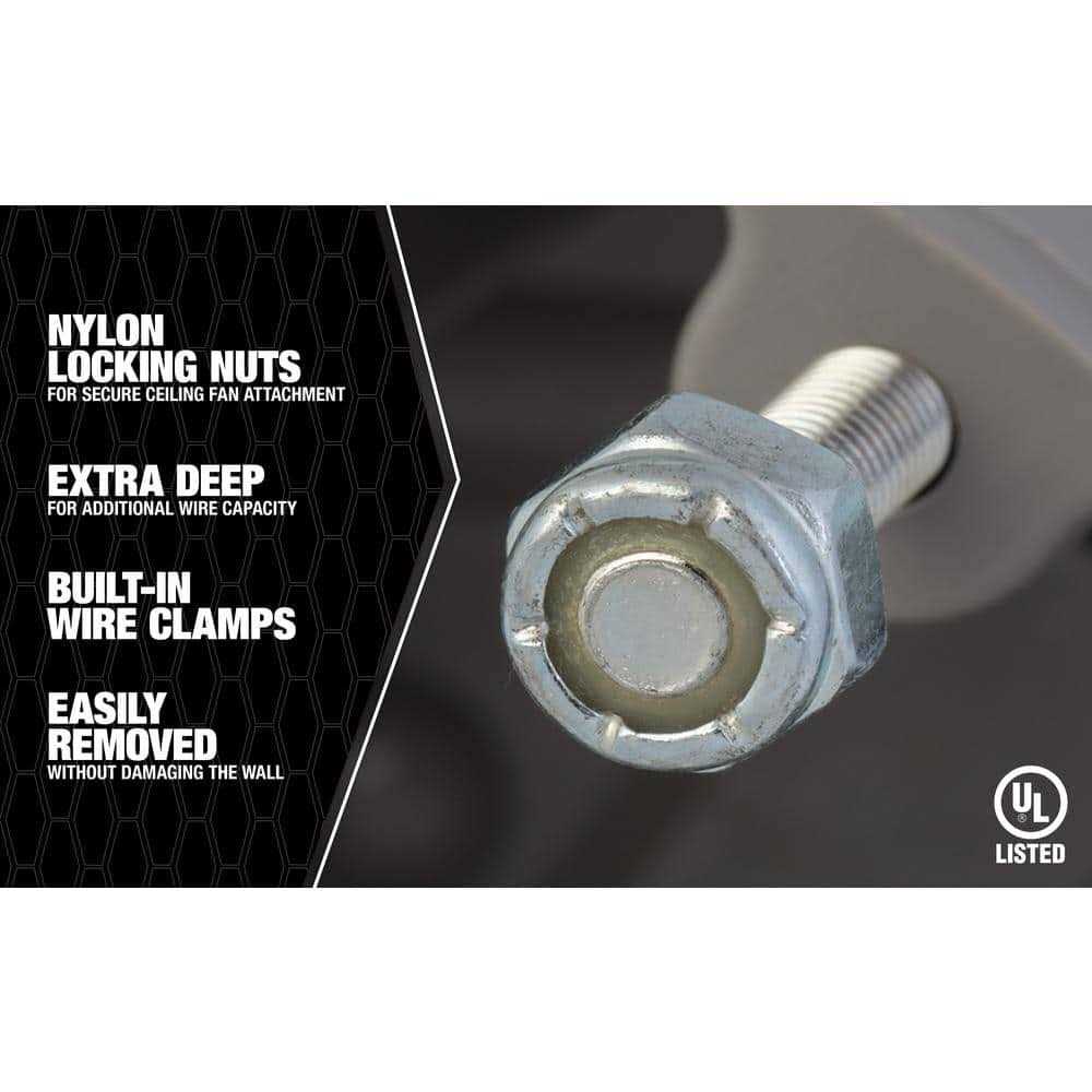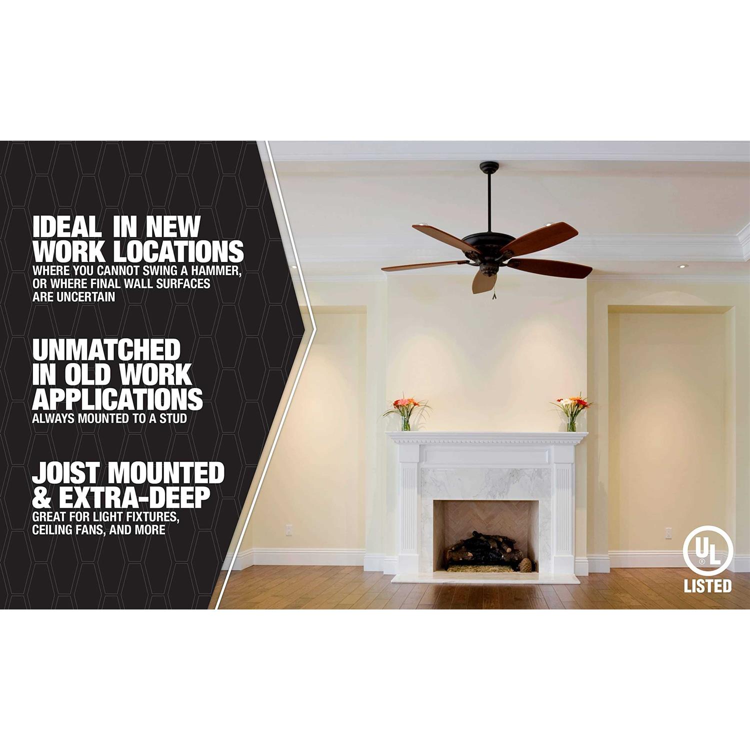 The light fixture Smart Box is a unique ceiling product with a UL listed rating for 50 lbs. light fixture support. It is the only nonmetallic ceiling box that includes two 1 in. #8 fixture support screws. This product is extra deep for mounting all smoke and carbon monoxide detectors. It is also quick and easy to remove for wiring between doors, cathedral ceilings and inaccessible attics. Add a cold rolled steel L-Bracket to this Smart Box and you now have a UL listed 50 lbs. paddle fan support box and a 75 lbs. light fixture support box that works for all kinds of job situations. It is side beam mounted with three 2 in. # 10 hex head screws verses bottom beam mounted.