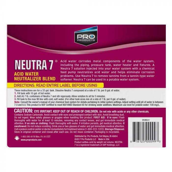Pro Neutra 7 is a proprietary alkaline compound which eliminates acid water in potable systems and keeps the injection point clean of build-up. This helps eliminate corrosion from piping, pressure tanks, water heaters and fixtures. A Pro Neutra 7 solution injected into a water system will eliminate acid water and prevent corrosion. Pro Neutra 7 is NSF Certified to meet NSF/ANSI Standard 60 for drinking water additives.
