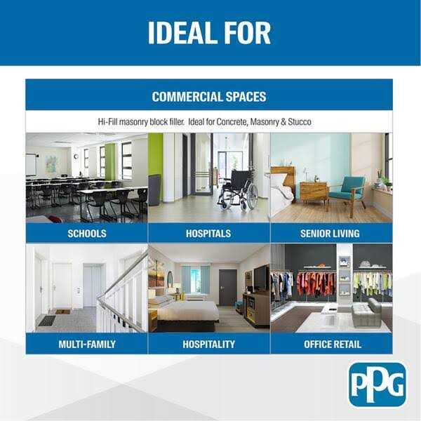 PPG Paints SpeedHide Interior and Exterior Block Filler is formulated to meet the performance requirements of professional painters and applicators. This one component acrylic latex block filler provides excellent filling properties on interior and exterior bare porous surfaces of light-weight concrete or cinder block as well as cured concrete and masonry. Can help earn LEED v4 points in the EQ Low-Emitting Materials Credit and the MR Building Product Disclosure and Optimization – Environmental Product Declarations Credit Provides smooth surface for priming, painting and topcoating Good adhesion, easy application Low VOC*, less than 50 g/L Do not apply over silicone-type water repellents Meets strict performance and aesthetic requirements Easy to apply and provide paint color sheen uniformity *Colorants added to this base product may increase VOC level significantly depending on color choice Excellent filling properties for concrete, masonry, stucco Minimizes peeling and cracking VOC compliant in all regulated areas* Exterior applications must be topcoated null PPG Paints SpeedHide Interior and Exterior Block Filler is formulated to meet the performance requirements of professional painters and applicators. This one component acrylic latex block filler provides
