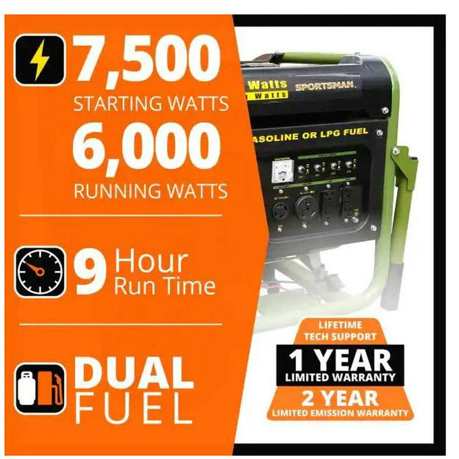 Sportsman 7,500/6,000-Watt Dual Fuel Powered Portable Generator with Electric Start and Runs on LPG or Regular Gasoline