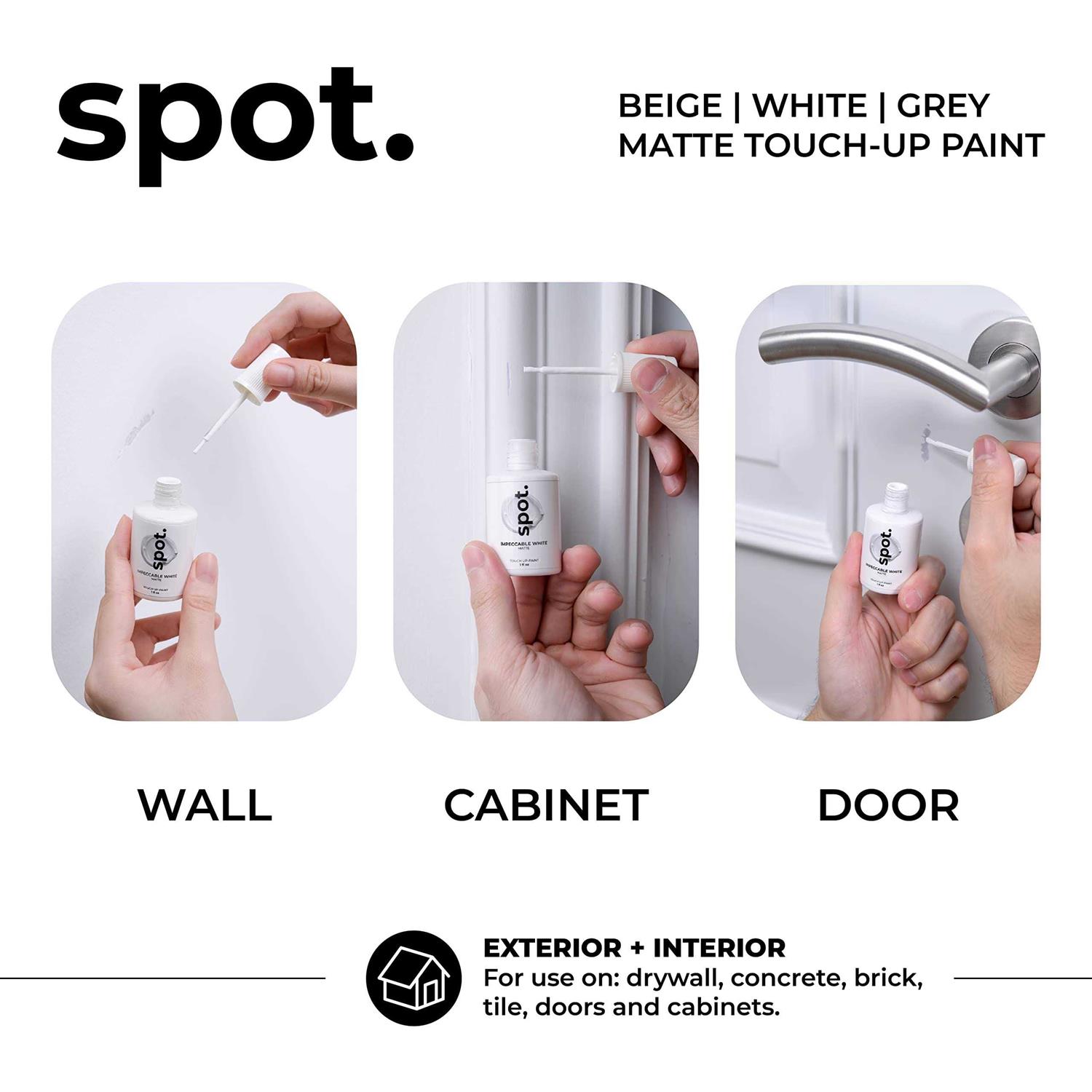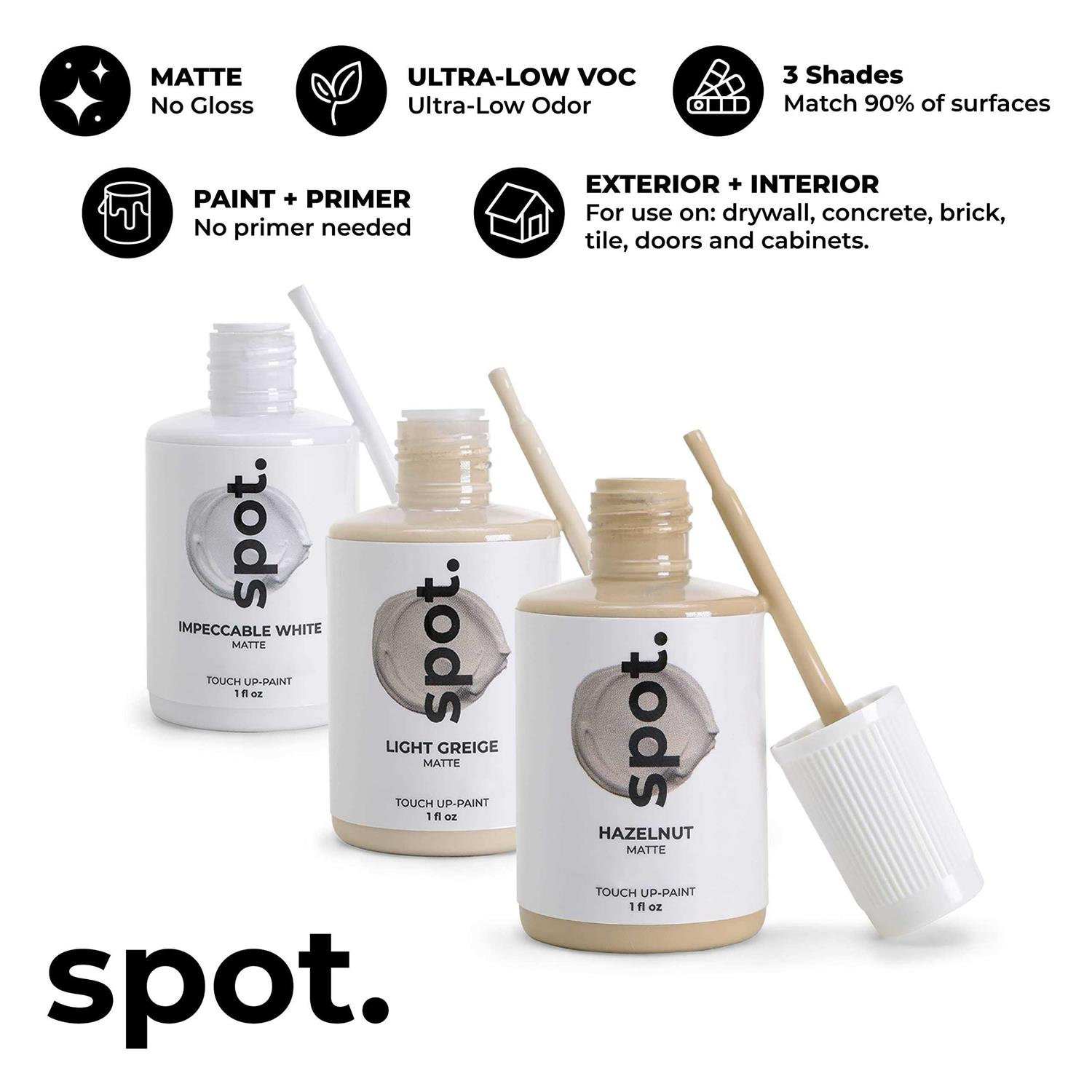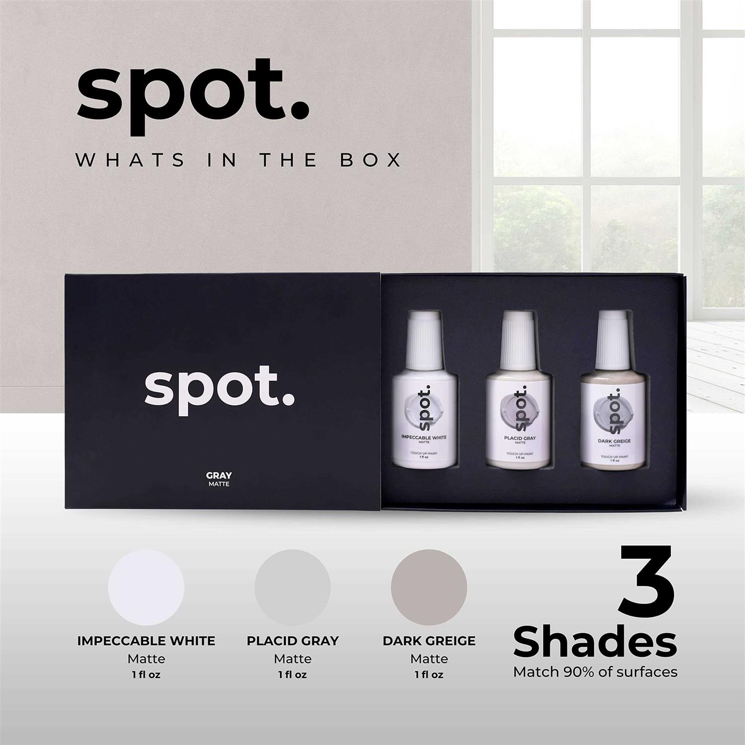 Spot. Touch Up-Paint, Matte Finish, for Cabinets, Walls, Windows, Doors, and Furniture, 3 Color Kit Matches 90% of Surfaces, Grey + White 3 Pack