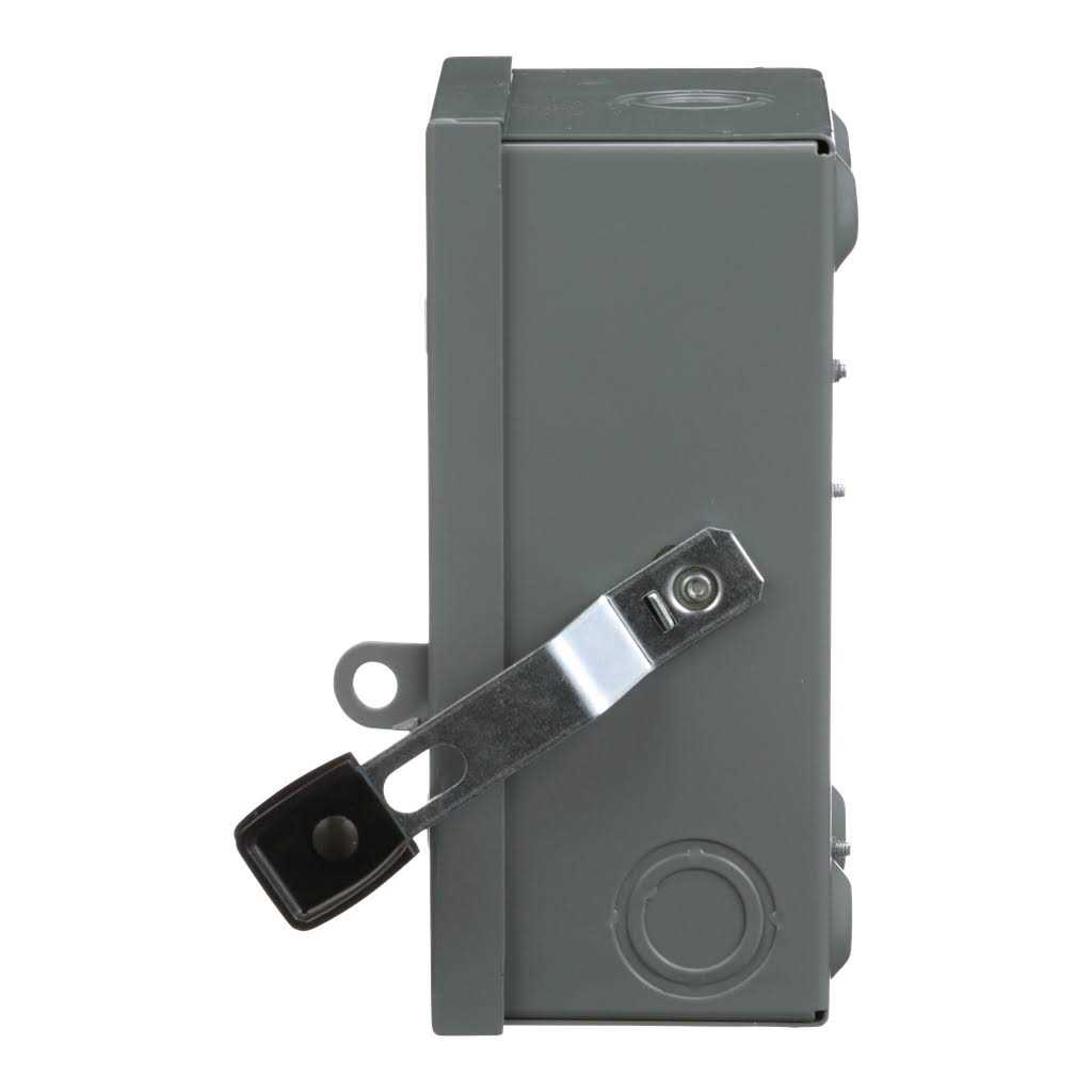 - The light-duty safety switch has visible blades and a ground lug as standard features