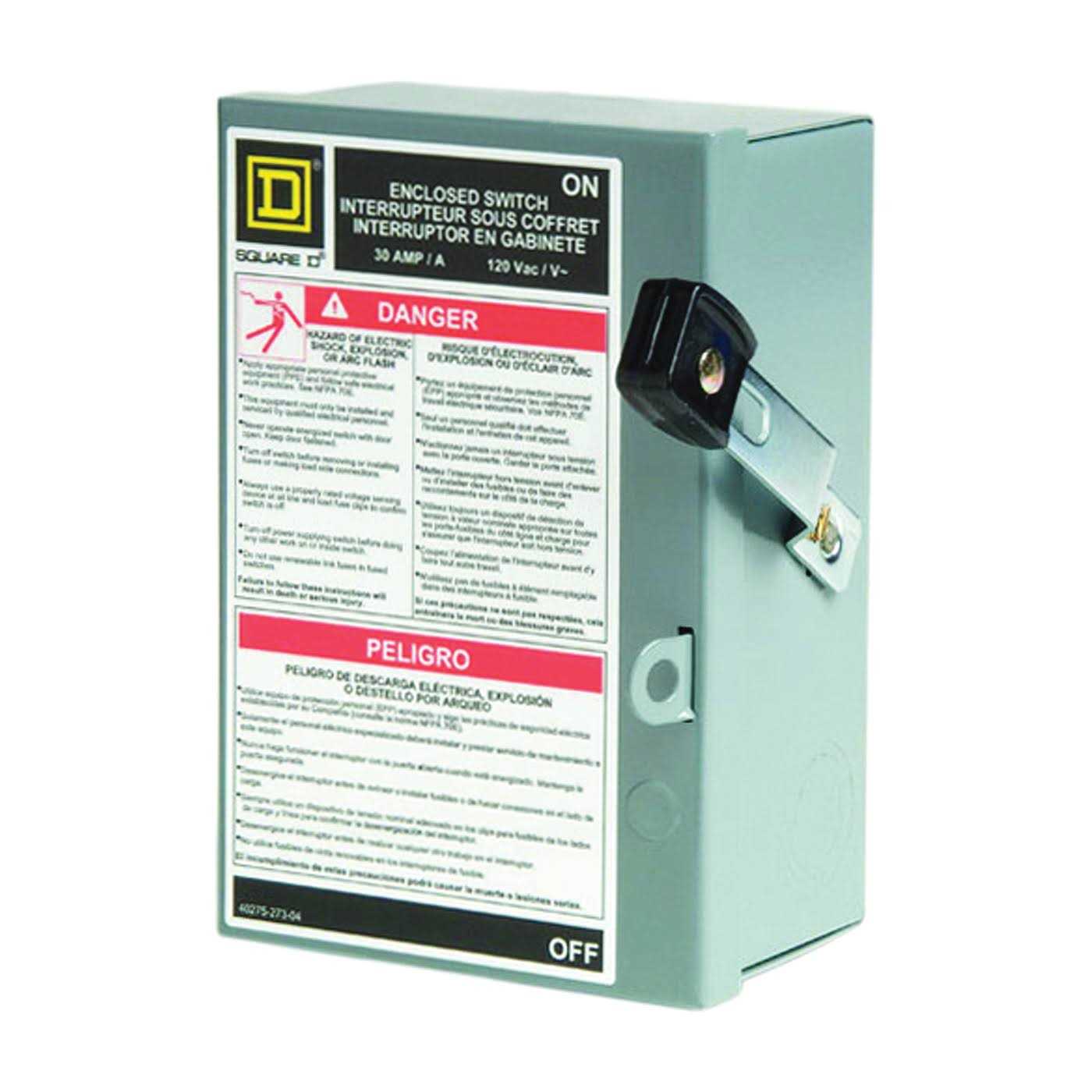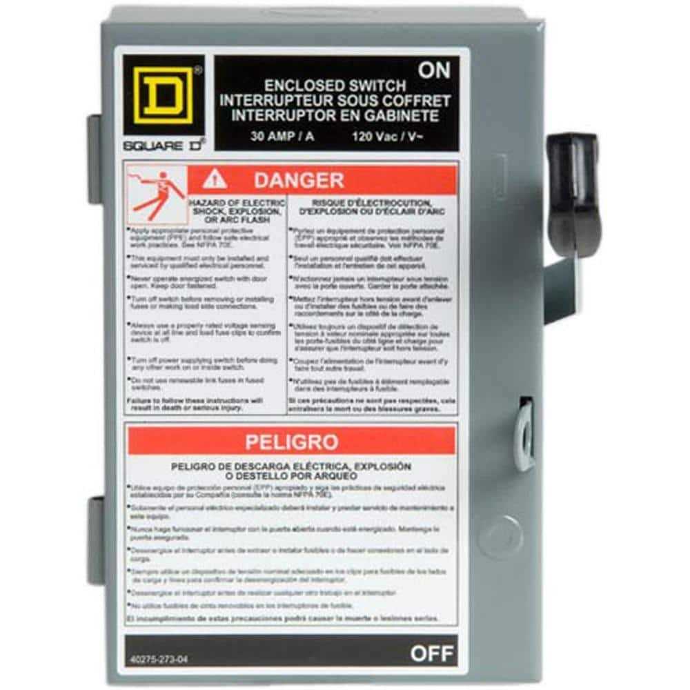 Light duty safety switches are ideal for home applications when disconnecting power to workshops, hobby rooms, furnaces and garages. The Square D light duty enclosed switch is ideal for home applications in disconnecting power to workshops, hobby rooms, furnaces, and garages. The light duty safety switch has visible blades and a ground lug as standard features. Light duty and general duty safety switches are UL Listed, File E2875, and meet or exceed the NEMA Standard KS1. This light duty Single Throw Safety Switch is a 1P, 30A, fusible disconnect with a rated current of 120 VAC. This switch has a neutral (factory installed) and is a NEMA 1 enclosure and is surface mounted. This safety switch accepts plug fuses only. The tightening torque for the lugs are 30-30 lbf.in, for a AWG 14 / AWG 8 copper and a cable cross section of 2.082-8.367 mm². This will also accept an AWG gauge of AWG 12 / AWG 8, aluminium for a tightenig torque of 30-30 lbf.in and a cable cross section of 3.307-8.367 mm². Dimensions for this product are 7.63 in (H),6.13 in (W),4 in (D).