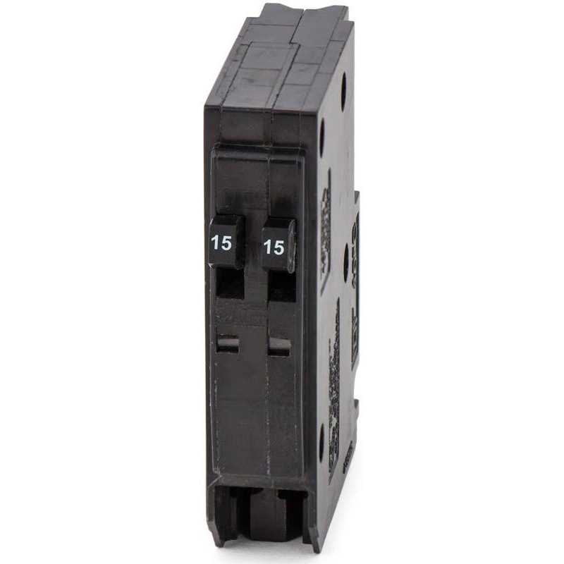 QO and QOB one, two and three pole thermal magnetic circuit breakers provide overcurrent protection and switching on ac and dc systems. These circuit breakers have an over center, trip free toggle mechanism with quick make, quick break action and positive handle indication. They also have VisiTrip trip indication, which provides a visual indication that the circuit breaker has tripped and interrupted the circuit. This QO tandem mini circuit breaker has 2 one pole at 15A for 120/240VAC This unit provides 10kA breaking capacity and plug in mounting. A full line of features and factory installed accessories are also available such as shunt trips, auxiliary switches and alarm switches. QO circuit breakers are UL Listed under UL File E84967 and are CSA Certified under CSA Master Contract 153555 A full line of accessories are available. The box lugs will accept one 14 AWG to 8 AWG copper or 12 AWG to 8 AWG aluminum wire. This circuit breaker has a height of 3.22 inches, a width of 0.75 inch and a depth of 2.91 inches. QO tandem circuit breakers are UL Listed and CSA certified.