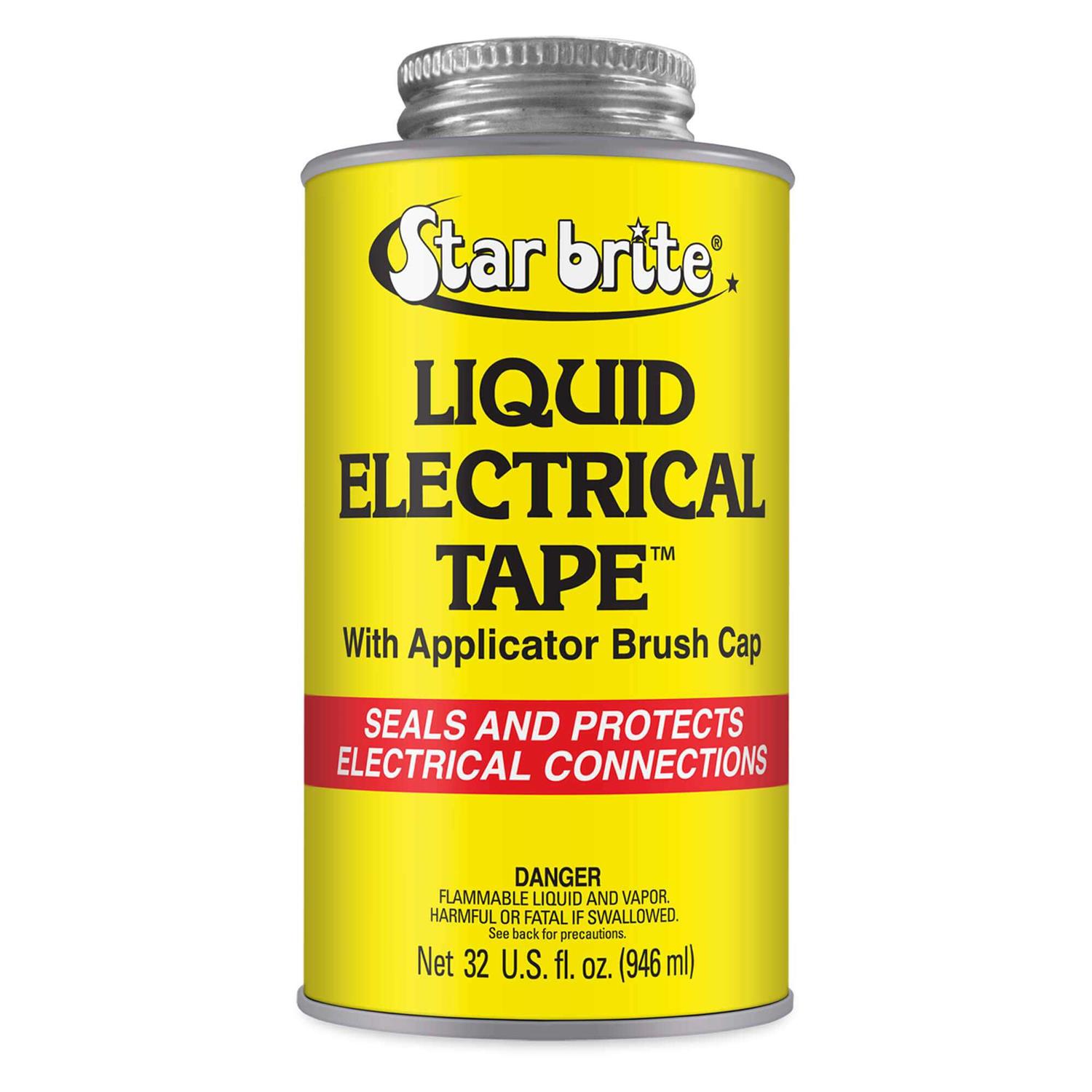 Star Brite liquid electrical tape Forms a waterproof, UV resistant, dielectric coating on wires and connections Prevents corrosion on wires and terminals and protects against vibration Cap has convenient brush applicator that makes it easy to apply Thousand of uses around the home, boat, RV, as well as industrial uses Creates a totally sealed joint which is flexible and heat resistant Dries to the touch in about 10 minutes and fully cures in 24 hours Once product dries it can be easily removed if needed Sticks to most surfaces including metal, plastic, vinyl, rubber and composite surfaces Retains flexibility after drying and provides dielectric protection White color UL tested 32 ounce can
