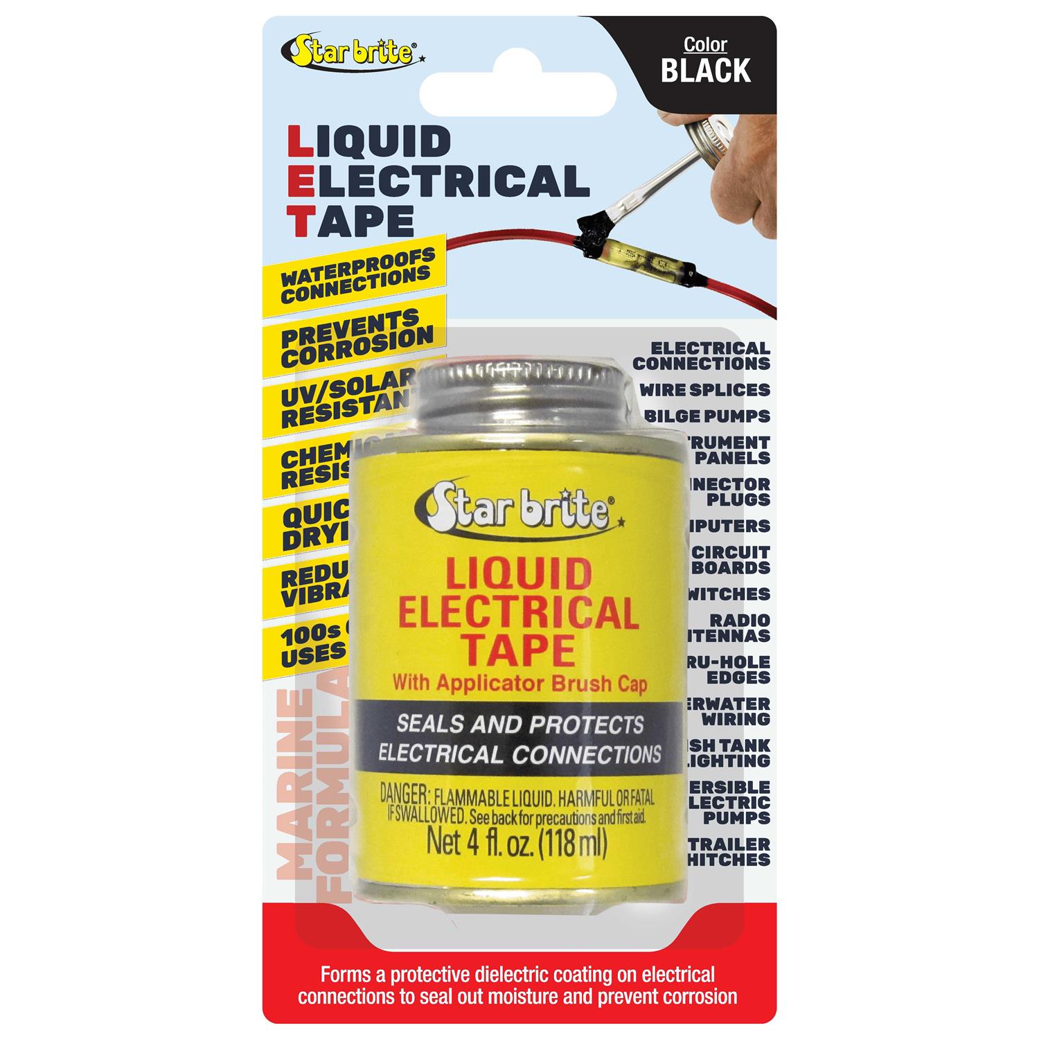 Liquid Electrical Tape (LET) is easy to use, providing an airtight, waterproof, dielectric coating in minutes. The coating will last for the life of the application, yet it can be removed immediately as needed. One application will protect terminal connections or splices, as well as guard against vibrations that can loosen connections. STAR BRITE Liquid Tape is easy to use and reliable. Stir well before use. Wires or terminal to be sealed must be clean and dry. Brush or dip STAR BRITE Liquid Electrical Tape on electrical connection area. Allow to dry for 5 minutes and apply second coat if greater thickness of seal is needed. Succeeding coats may be applied at 5-minute intervals to build up extremely thick protection. The product fully cures in 24 hours.