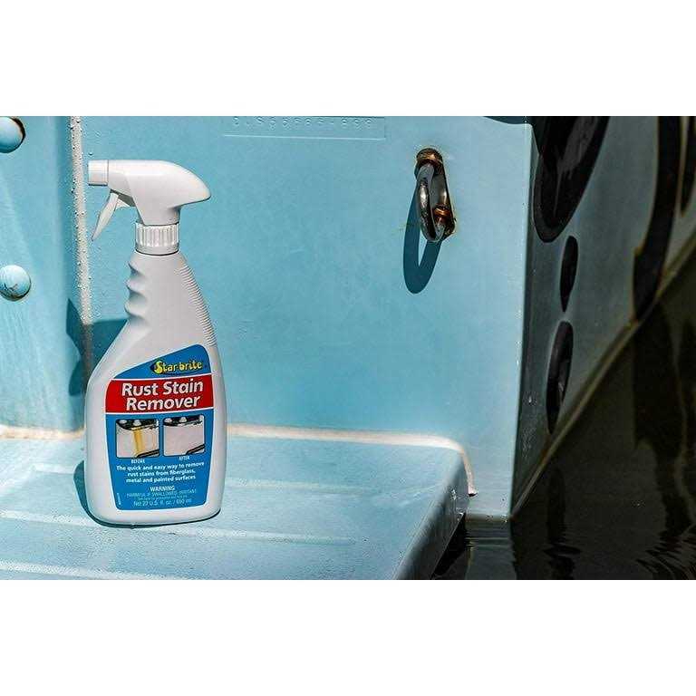 Cleaners by STAR BRITE. Details:Rust Stain Remover is the best way to eliminate unsightly rust stains from boats, RVs, exterior walls of homes or wherever else they may form. The formula begins working on contact, dissolving the oxidation that causes these stains. Easy to use; spray directly onto stained area and rinse off; no heavy scrubbing needed. DIRECTIONS: Spray Star brite Rust Stain Remover directly on surface to be treated. Let product work until stain is gone before rinsing area with fresh water. Deep stains may require a second application and light scrubbing with a brush or cloth. To help prevent future rust stains, apply a protective coating of Star brite Polish to cleaned area to seal surface pores. Avoid contact with fabric. Test area to be cleaned for colorfastness in an inconspicuous area before proceeding with overall cleaning.
