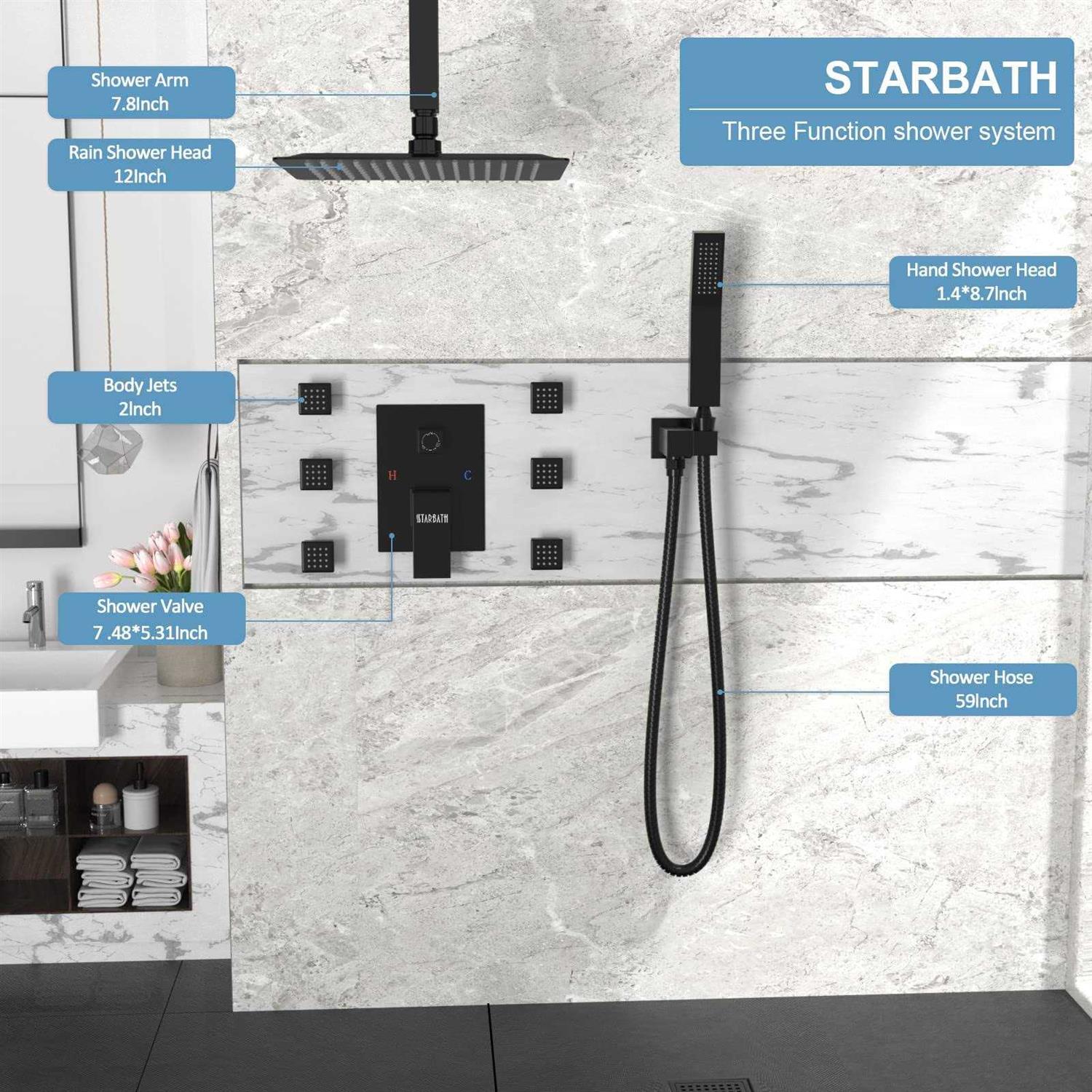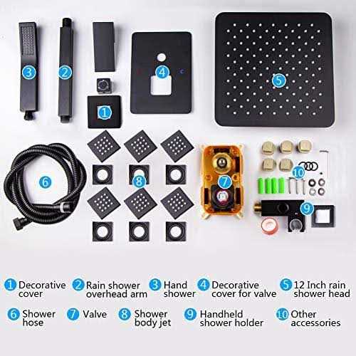 【ANTI-SCALD ROUGH IN MIXER VALVE】: Starbath shower system includes advanced pressure balance ceramic disc cartridge with cUPC certification, which can effectively protect you from scalding injury caused by sudden changes in hot or cold water pressure, maintaining consistent water temperature. 【THREE FUNCTIONS】3 functions matte black shower system, even in low water pressure, shower spray jets can also provide a powerful shower, you can switch effortlessly from rain shower head to body jets or hand spray as you like(can NOT use together). 【ADJUSTABLE ANGLE PARTS】: 12” rain shower head, handheld sprayer, and body jets of this shower head system are upgraded with the angle-adjustable feature, which can provide you the ideal shower angle. 6pcs shower body jets help you relaxing your muscle, you can enjoy a Full-Body Shower. 【CONCEALED INSTALLATION】Shower bracket holder, shower arm and shower mixer valve of this shower faucets system are NPT threaded, the American standard NPT1/2 connector is compatible with any type of pipe. /b br 1 x 12″” Rain Shower Head br 1 x Hand Shower Head br 6 x Shower Body Jets br 1 x Shower Mixer Valve Control br 1 x Hand Shower Holder br 1 x Rain Shower Arm br 1 x Shower Hose br Other accessories br 1 x Installation Instruction br”