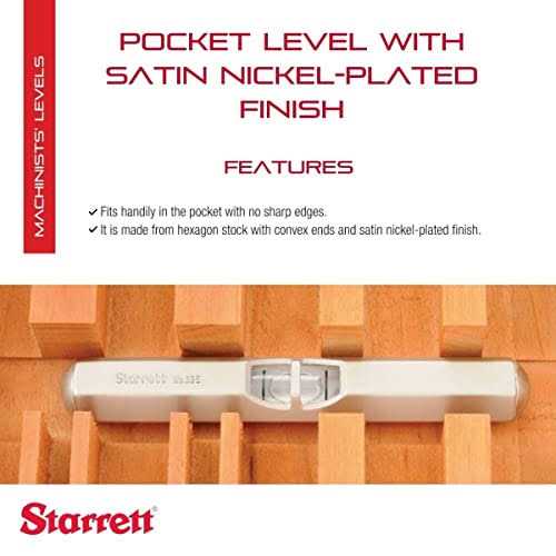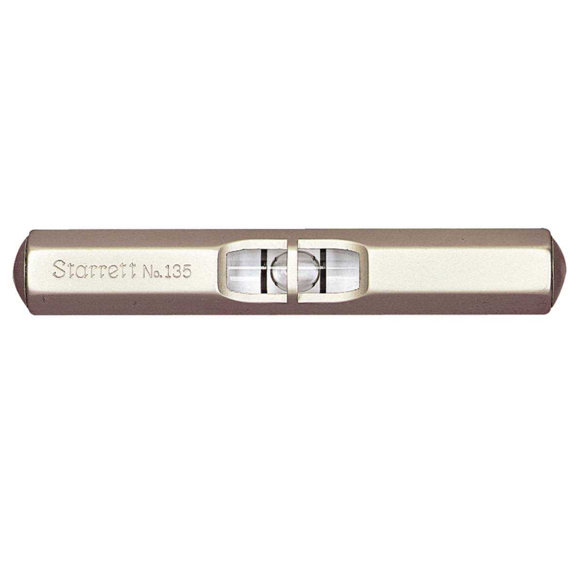 The vial is made of glass to resist scratching and provide clear readings. and has a sensitivity of 17 to 21 minutes. The level has a hexagonal brass body with a satin nickel-plated finish that resists corrosion. Levels are used in the building trades. engineering. surveying. and metalworking. among other applications. Levels are instruments that are used to determine the true horizontal or vertical plane of a surface. The most common type of level is the spirit level. or bubble level. Spirit levels have a liquid-filled. bowed tube (also called a vial) with a bubble that moves when slight adjustments are made to the level. When the bubble settles between marked points on the vial. it indicates that a surface is horizontally or vertically straight. Levels can have one or more vials to determine the horizontal plane. the vertical plane. or various points between. such as a 45-degree angle. simultaneously. Some levels include a laser line indicator that projects a horizontal or vertical beam on a surface. Bullseye levels. or surface levels. are circular. flat-bottomed spirit levels that determine whether a surface plane is level. Levels can range from highly-complex and accurate machines. such as those used in the surveying and construction industry. to precision instruments used in carpentry and other building trades. to simple. pocket-sized devices for do-it-yourself projects. The L.S. Starrett Company manufactures precision measuring tools. metrology and testing equipment. and saw blade products. The company. founded in 1880. is headquartered in Athol. MA.