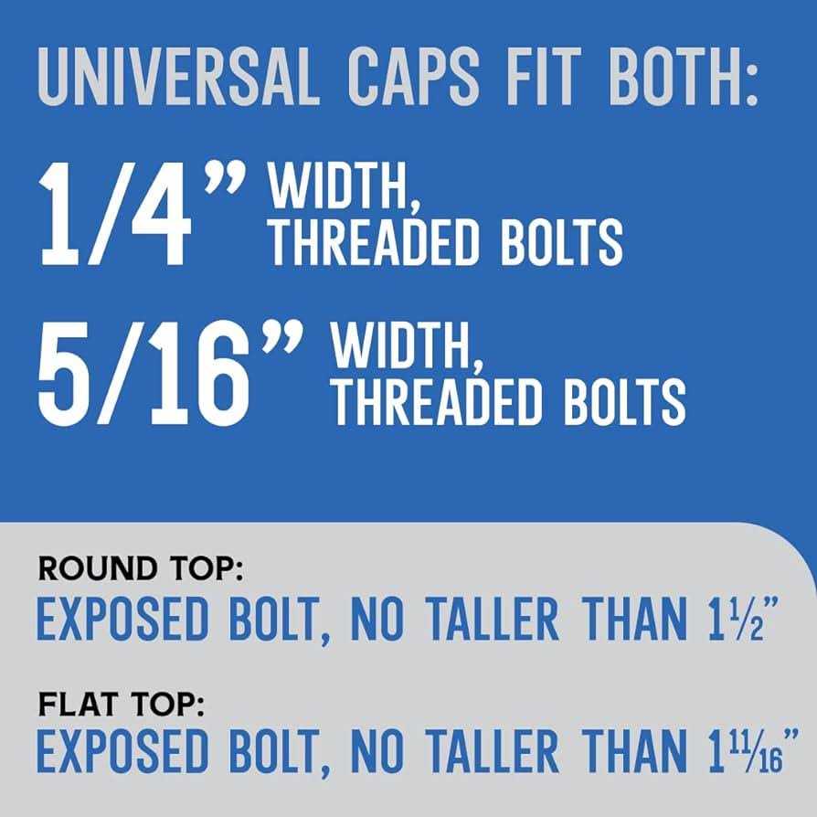 - Universal Size: These caps will fit either 1/4 inch or 5/16 inch threaded bolts. Round Top Style is 1/8 inch taller than flat top style.