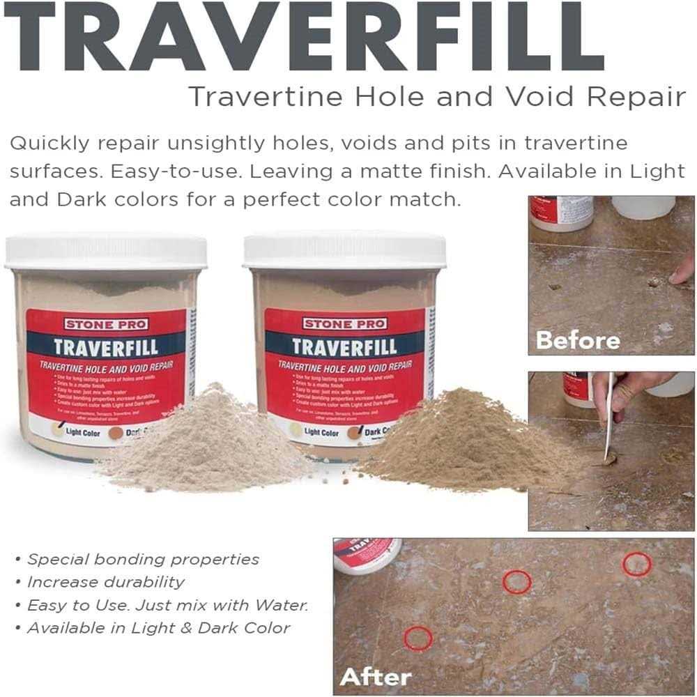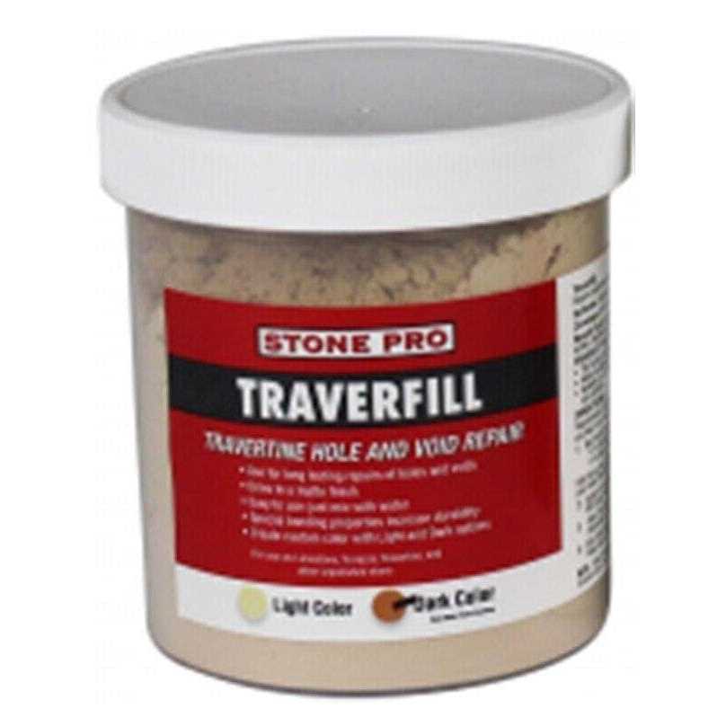 Traverfill is an easy-to-use travertine repair product that permanently repairs unsightly holes, voids, and missing travertine fill. If unsightly holes and pits are making your travertine floor look horrible, StonePro Traverfill is your answer. Traverfill is available in either LIGHT or DARK colors to match most travertine and can be mixed to create your own custom color. Dries to a matte finish. This powder is converted to a paste by adding water and is applied like spackle. Seal with StonePro Porous Pro Impregnated Sealer.