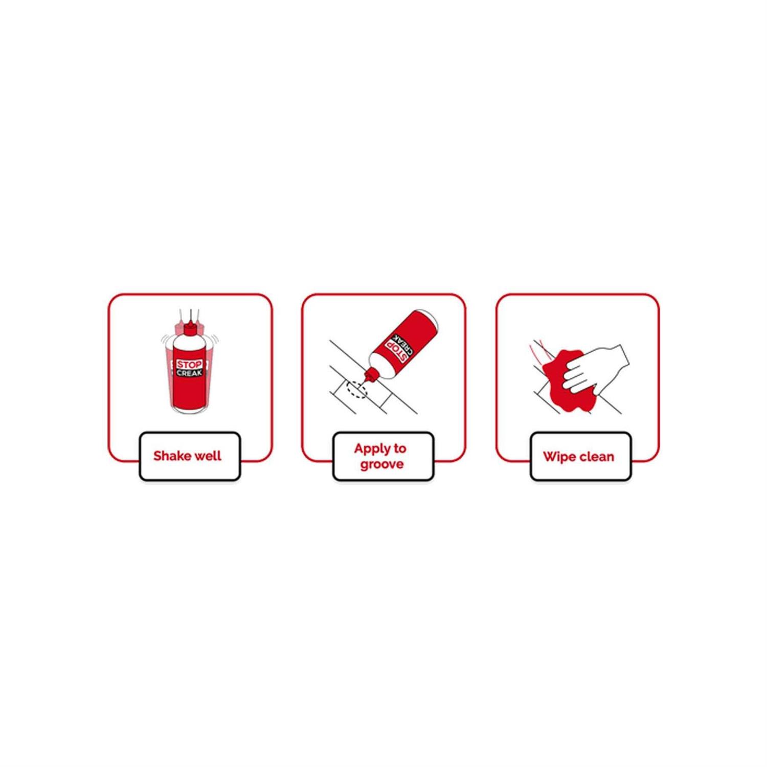 • Identify the area where creaking occurs and apply a bead of Stop Creak to the groove.