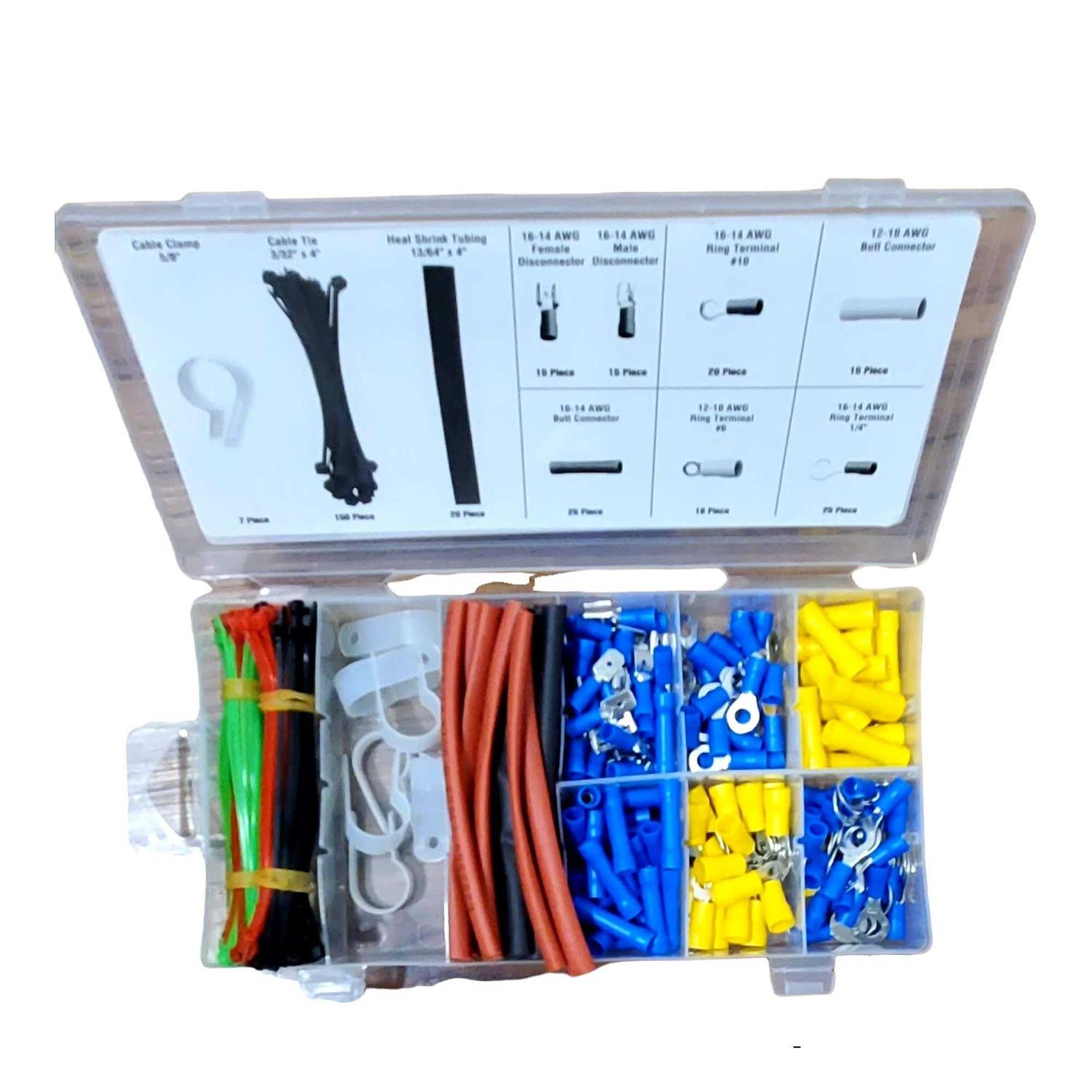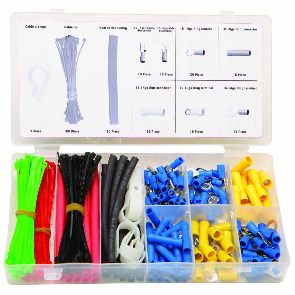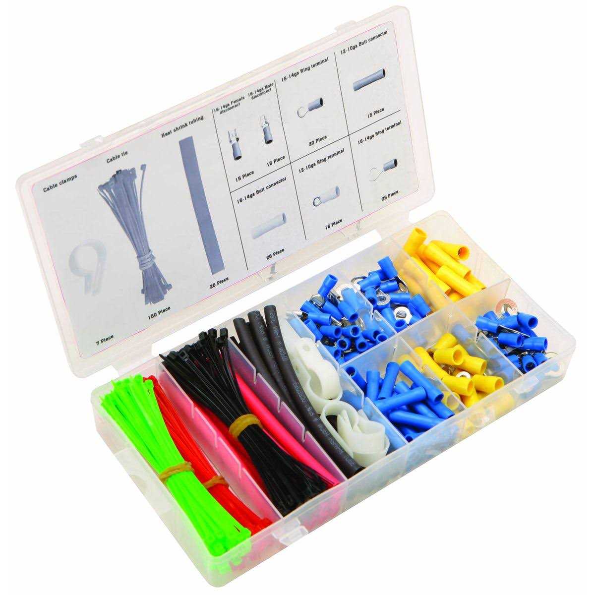 Connect/disconnect for 14-16 AWG wire Organized Case withCchart for Easy Identification Butt Connectors for 14-16 and 10-12 AWG wire Ring Terminals for 14-16 and 10-12 AWG wire This wide selection of cable ties, cable clamps, terminals and connectors is essential for any electrician or do-it-yourselfer to handle a wide range of electrical applications. This versatile set of electrical connectors is ideal for wrapping wire harnesses, ensuring a secure connection without soldering and organizing cables, wires, tubing and rods with ease. The set comes organized in a convenient PVC case for easy transport and storage.