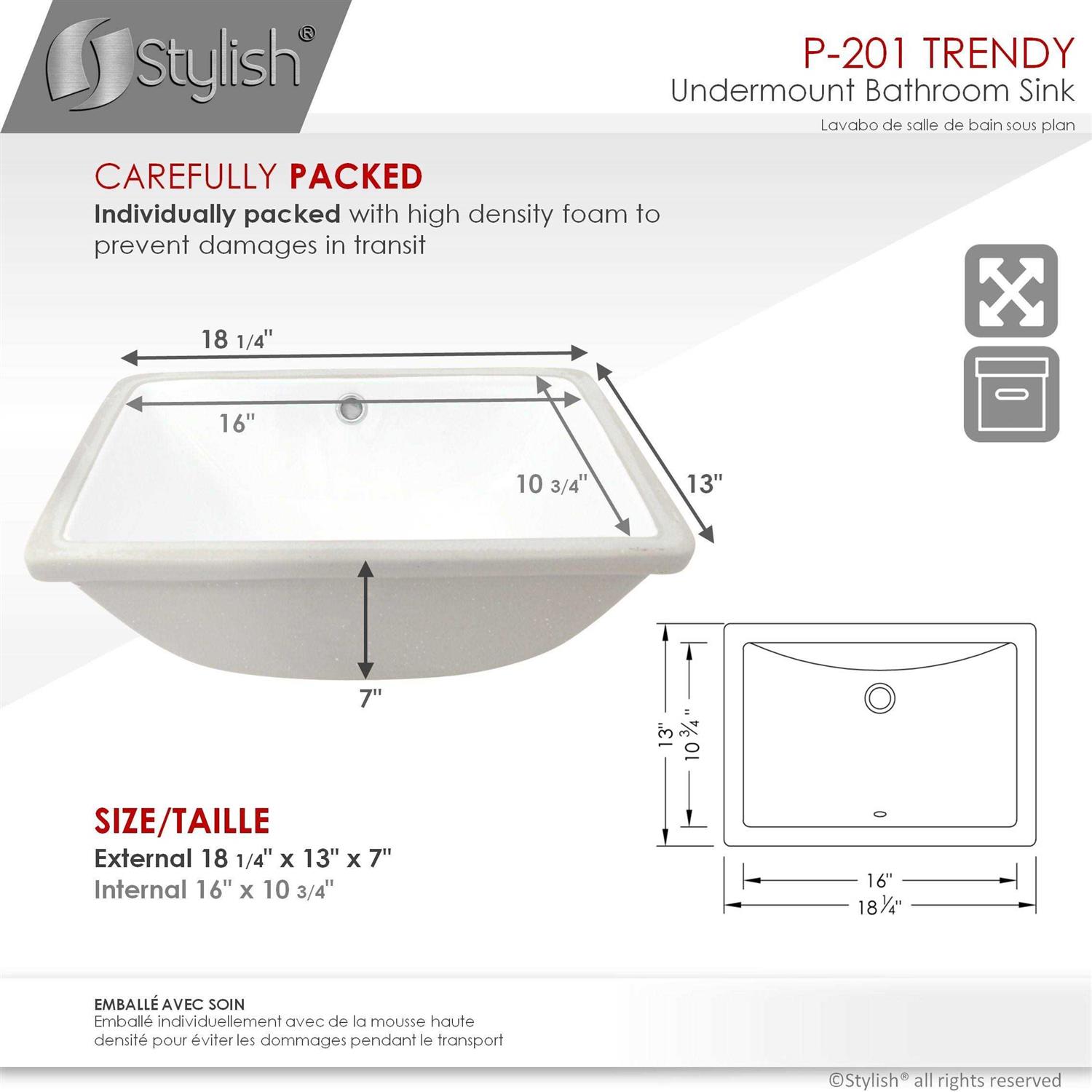This bathroom undermount rectangular ceramic porcelain sink features a classic and elegant design that will enhance the look of any bathroom. The sink’s glossy finish makes it easy to clean and guarantees a flawless appearance for years to come. With a premium baked-on glaze for an easy-to-clean high-gloss finish and a smooth, non-porous surface this STYLISH International bathroom sink is naturally hygienic and durable. Beautiful and timeless this bathroom undermount sink features a combines high quality ceramic, ultra resilient craftsmanship, and stain resistant properties.