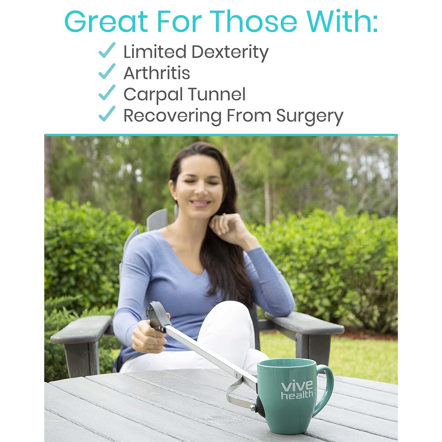 The Vive Reacher Grabber is great for those with limited dexterity, arthritis and for those recovering from surgery or injury. Adding 32 inch to your reach, the Vive suction reacher allows you to reach items stored on high shelves, dropped behind furniture, or other tight places and items on the ground without constant bending and stretching. Easily change light bulbs without using a step stool. Two rubber suction cups provide a secure grip on any item, including smooth or slippery objects like glass or metal, without damaging the surface. The wide leaf style jaws close tightly, easily retrieving dropped coins or pills with ease. The strong jaw can also hold items weighing up to five pounds. The reaching aid device is constructed with durable, corrosion-resistant brushed aluminum. The reach extender tool is suitable for indoor and outdoor use. The frame is exceptionally lightweight to reduce arm and hand fatigue from constant use. The trigger grip handle is ergonomically designed to fit comfortably and easily in the hand and also includes a built-in hanger for convenient storage when not in use. The Suction Cup Reacher is the ultimate multi-purpose tool. Feel the difference in everyday activities such as gardening, picking up trash, reaching the top shelf, getting behind furniture/appliances, and much more.