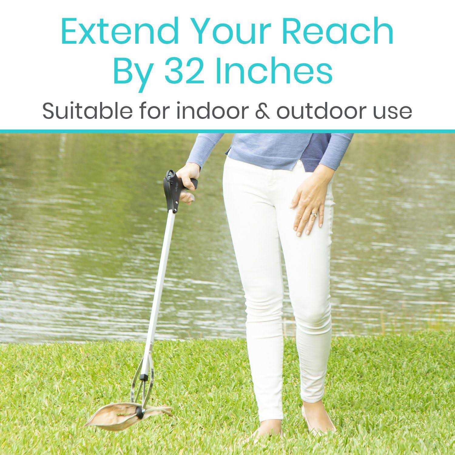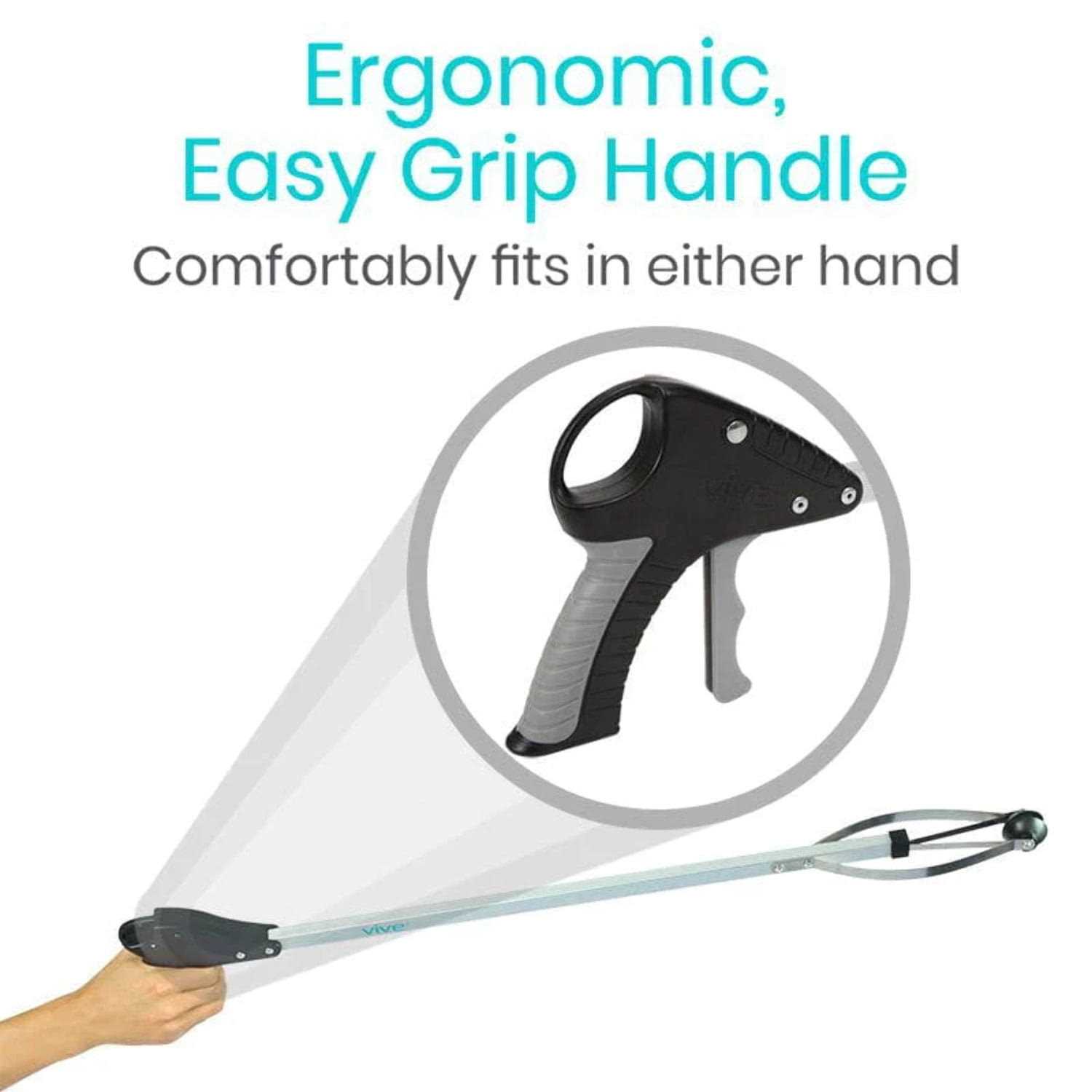 The Vive Reacher Grabber is great for those with limited dexterity, arthritis and for those recovering from surgery or injury. Adding 32 inch to your reach, the Vive suction reacher allows you to reach items stored on high shelves, dropped behind furniture, or other tight places and items on the ground without constant bending and stretching. Easily change light bulbs without using a step stool. Two rubber suction cups provide a secure grip on any item, including smooth or slippery objects like glass or metal, without damaging the surface. The wide leafstyle jaws close tightly, easily retrieving dropped coins or pills with ease. The strong jaw can also hold items weighing up to five pounds. The reaching aid device is constructed with durable, corrosion-resistant brushed aluminum. The reach extender tool is suitable for indoor and outdoor use. The frame is exceptionally lightweight to reduce arm and hand fatigue from constant use. The trigger grip handle is ergonomically designed to fit comfortably and easily in the hand and also includes a built-in hanger for convenient storage when not in use. The Suction Cup Reacher is the ultimate multi-purpose tool. Feel the difference in everyday activities such as gardening, picking up trash, reaching the top shelf, getting behind furniture/appliances, and much more. Age Group: adult.