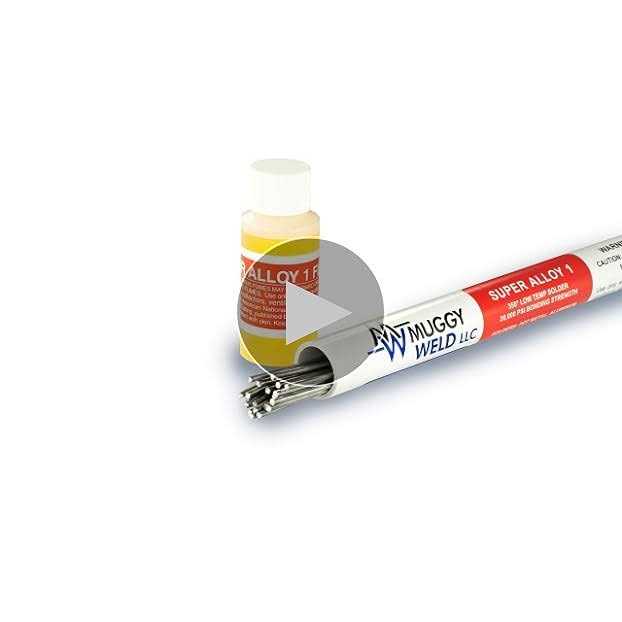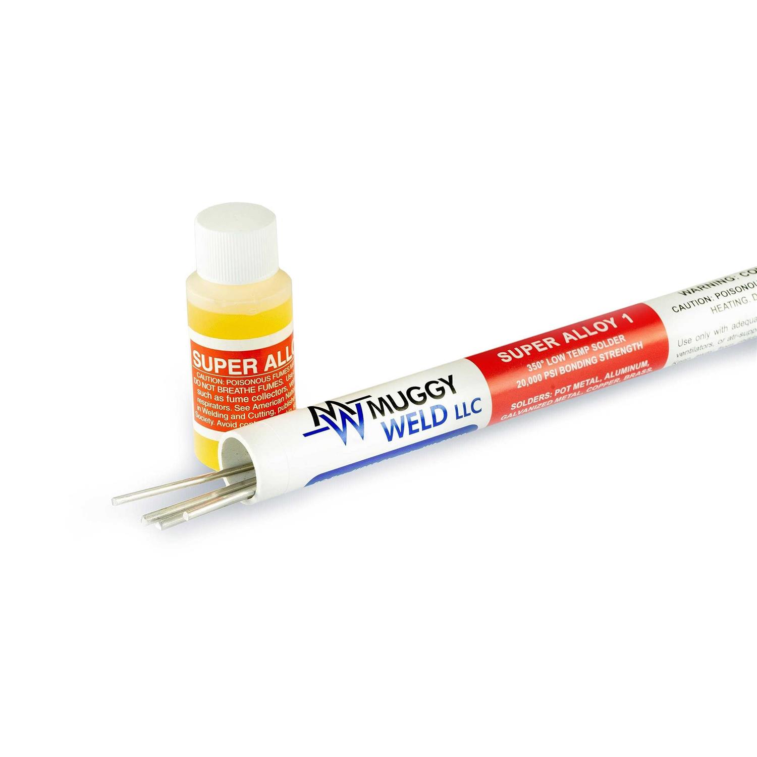 Contains: 2 rods 3/32 diameter, 2 rods 1/8 diameter 1 oz liquid flux 350°F working temperature prevents warpage and base metal damage 20,000 psi bonding strength Bonds dissimilar metals: brass to aluminum, copper to stainless Works with: propane, MAPP gas, oxyacetylene, butane, heat gun, soldering irons etc Muggy Weld Super Alloy 1 Mixed Diameter Sample