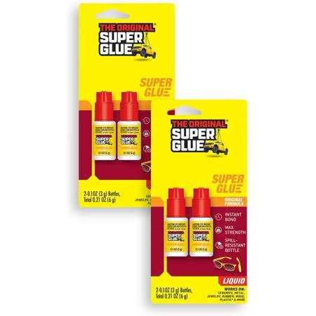 This double pack of original formula Super Glue forms the strongest bonds in tight joints between clean breaks or smooth surfaces. Best used with non-porous application parts such as metal and rubber. The glue bonds instantly and sets in seconds! Packaged in a spill-resistant bottle with a flow control nozzle allowing for one-drop-at-a-time application. The slim card is perfect for tight displays, end-caps and clip strips.