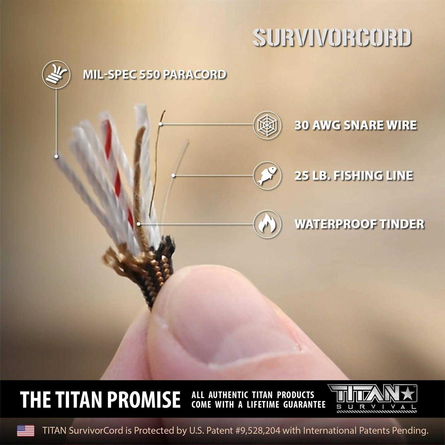 TITAN SurvivorCord – Simply the last paracord you’ll ever need. TITAN SurvivorCord is our patented parachute cord that integrates 3 potentially life-saving survival strands into our popular high-performance MIL-SPEC 550 cord.
