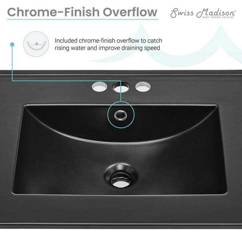 The Swiss Madison Ceramic Vanity Top Sink is ideal for larger faucet types. It’s integrated vanity top and sink offers easy installation and a practical style. Rounded edges and high gloss shine make for an excellent addition to any bathroom. Easy to mount and simple to clean. High Gloss finish protects sink from scratches and stains. Centered 3 hole faucet mounting. Overflow drain included.