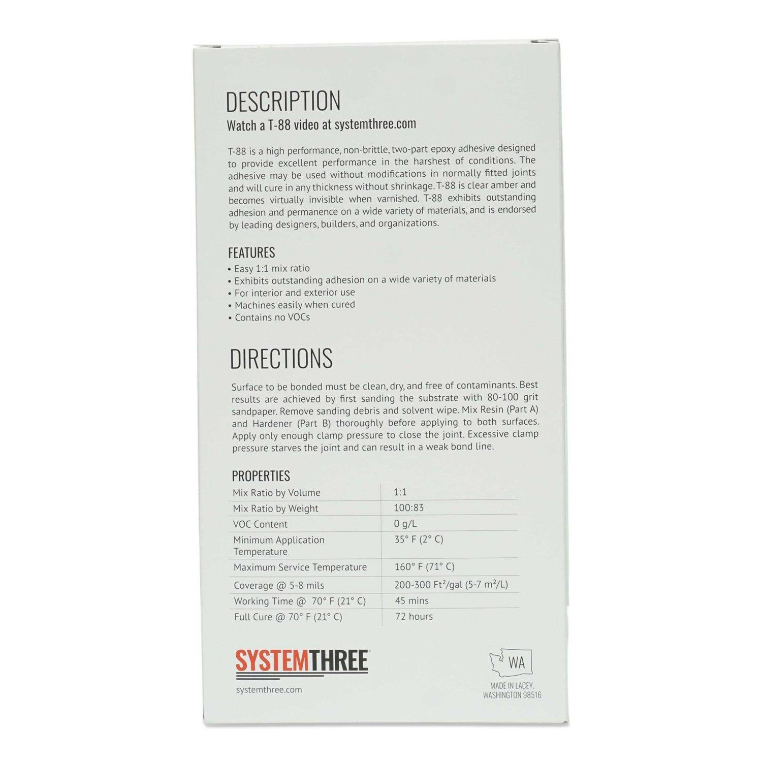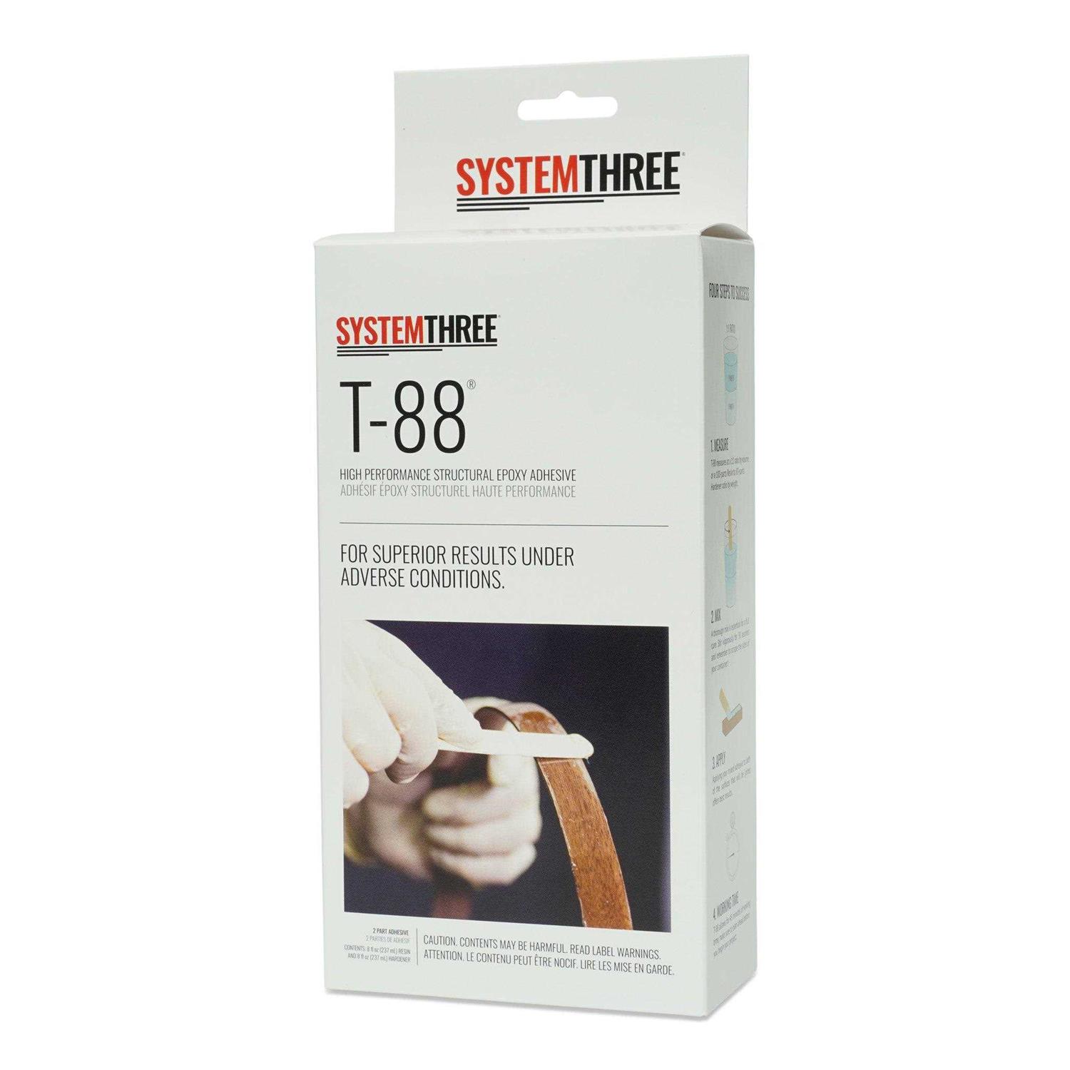 System Three T-88 is a waterproof non-brittle two-part epoxy adhesive designed to give superior results under adverse conditions. The adhesive may be used without modification in normally fitted joints and will cure in any thickness without shrinkage. It is a clear amber and becomes virtually invisible when varnished. T-88 exhibits outstanding adhesion and permanence on a wide variety of materials and is endorsed by leading designers builders and organizations.