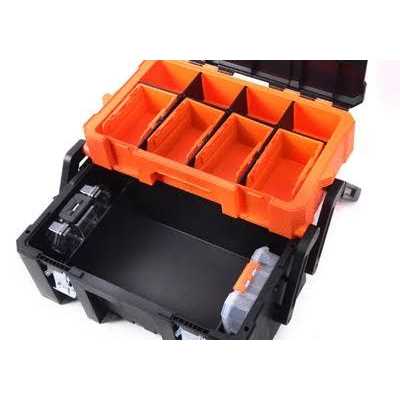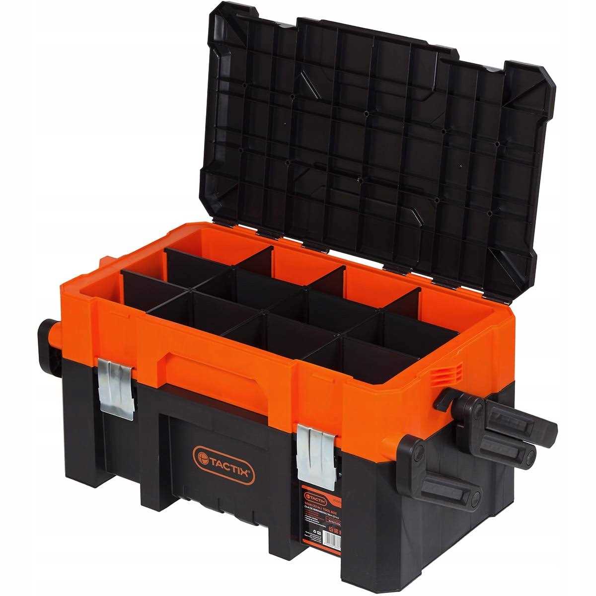 The Tactix Cantilever Toolbox is perfect for when the job takes you on the go or your basic storage needs. It has a bottom compartment big enough for storing larger tools, and the cantilever function allows for full access to the bottom compartment. The top compartment is perfect for storing and organizing smaller items as its designed with 15 individual compartments, and the dividers are removable so that you can customize it to perfectly fit your needs. Designed with professional-grade plastic construction, a full-length aluminum handle and steel latches for extra strength and durability. The Tactix Cantilever Toolbox is the perfect storage solution for any DIYer or professional. Full length aluminum handle 22-3/4 in. x 13-7/8 in. x 11-1/4 in. Steel latches for durability Cantilever function allows for full access to bottom box Removable dividers to customize compartments at top Professional grade construction null The Tactix Cantilever Toolbox is perfect for when the job takes you on the go or your basic storage needs. It has a bottom compartment big enough for storing larger tools, and the cantilever function allows for full access to the bottom compartment. The top compartment is perfect for storing and organizing smaller items as its designed with 15 individual compartments, and the dividers are removable so that you can customize it to perfectly fit your needs. Designed with professional-grade plastic construction, a full-length aluminum handle and steel latches for extra strength and durability. The Tactix Cantilever Toolbox is the perfect storage solution for any DIYer or professional.