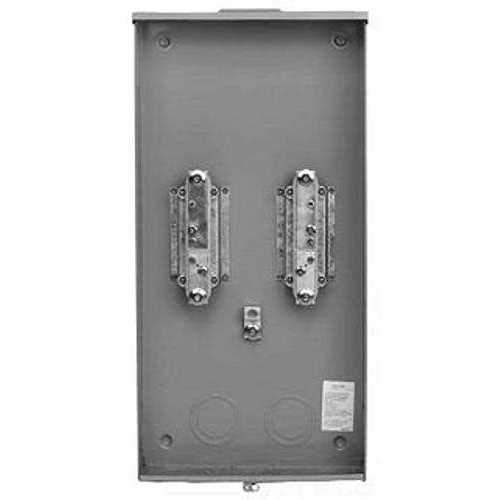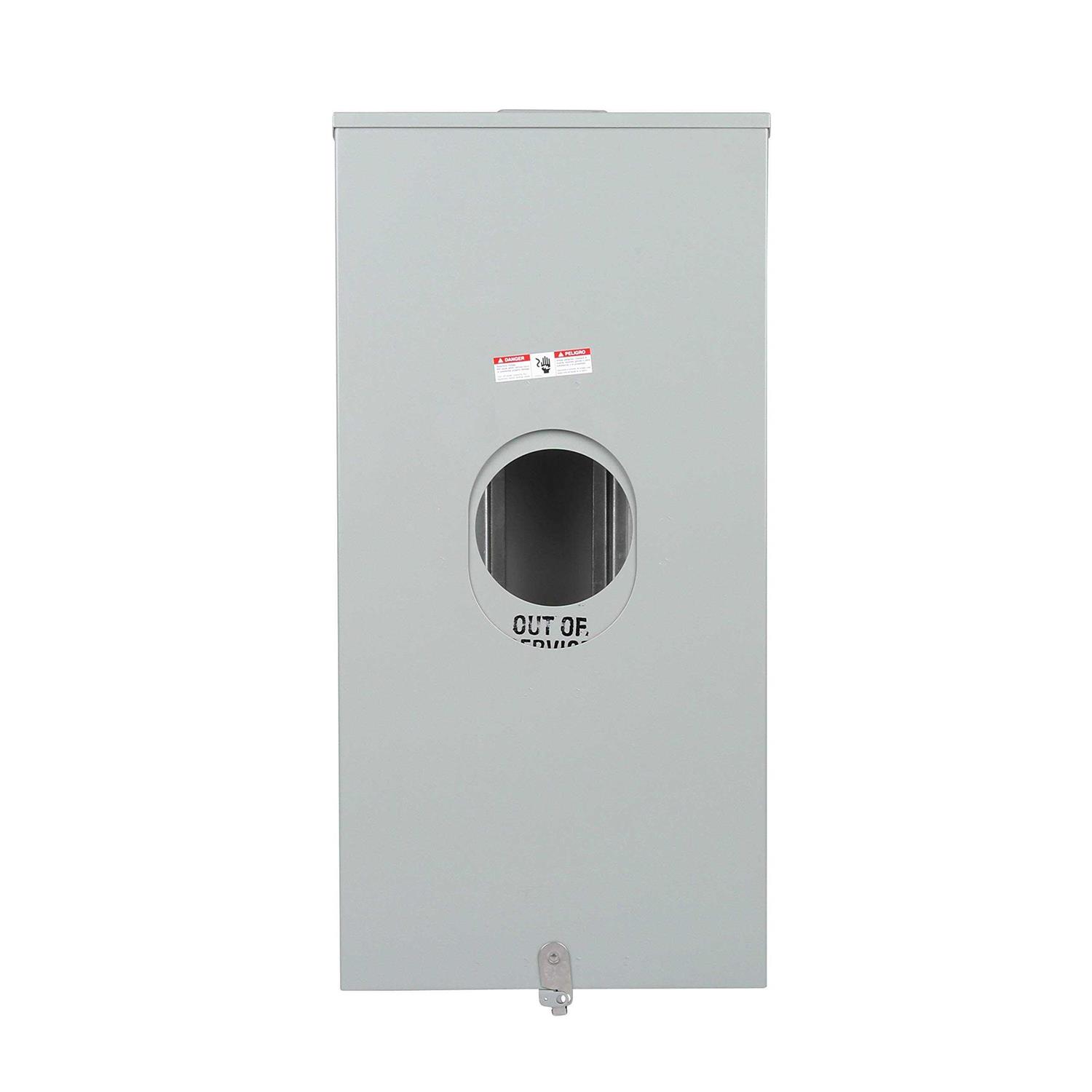 RINGLESS SERVICE TYPE OVERHEAD/UNDERGROUND CIRCUIT CONFIGURATION 1 PHASE 3 WIRE 300 VAC 400 AMPERE MANUAL BYPASS SWITCH 4 JAW(S) 4.281 INCH HD WITH CLOSING PLATE HUB (1) 1/4 INCH, (2) (1/2 INCH-3/4 INCH), (3) (2 1/2 INCH-3 INCH-3 1/2 INCH-4 INCH), (4) (2 1/2 INCH-3 INCH-3 1/2 INCH) CONCENTRIC KNOCKOUT KNOCKOUT(S) WIRE SIZE (2) 6 AWG TO 350 KCMIL (LINE/LOAD) NEMA 3R LIGHT GRAY BAKED POLYESTER POWDER 16/14 GAUGE G90 GALVANIZED STEEL ENCLOSURE SIZE 18 INCH WIDE X 6.1 INCH DEEP X 36 INCH HEIGHT APPROVAL UL 414, UL 486B APPLICATION RESIDENTIAL 9810-8502 400A 1-PHASE METER-SOCKET