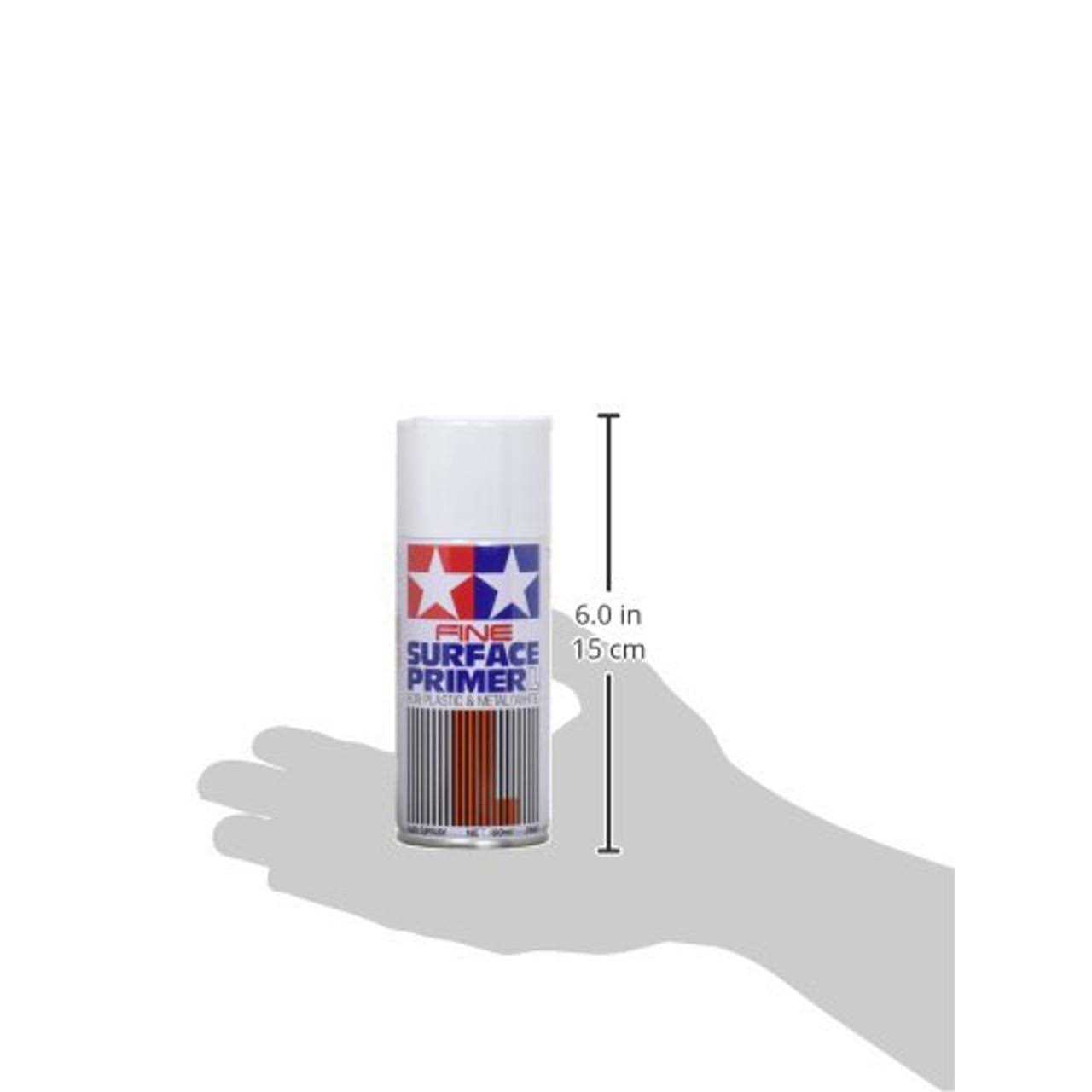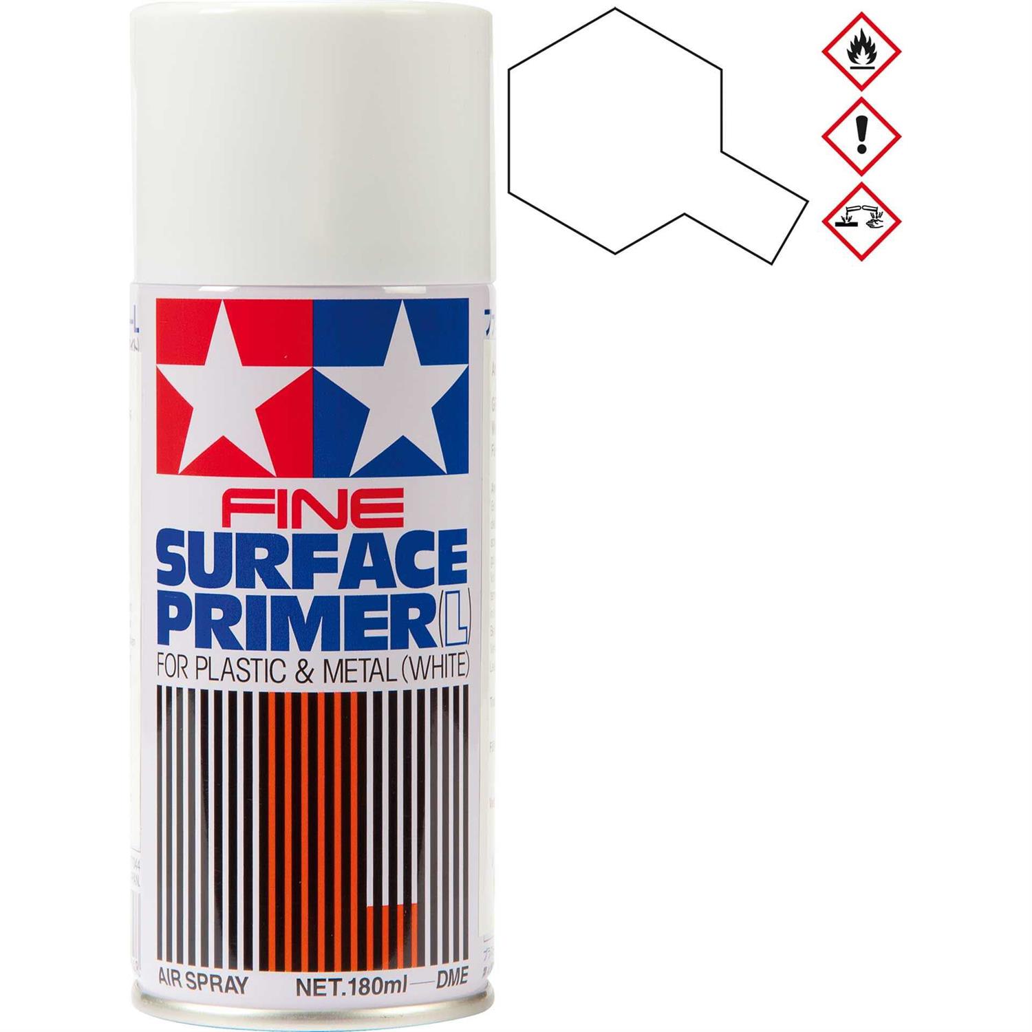 Tamiya Fine Surface Primer is ideal for preparing your plastic model parts made of ABS and Styrene plastic for paint. The primer may also be used for metal parts. The white color primer is great for light color applications; while Tamiyas gray surface primer is ideal for dark color applications. Both primers bite well into plastic surfaces and even fill in small scratches and imperfections. Tamiyas surface primers may also be wet sanded before paint is applied. Each can contain 180ml.