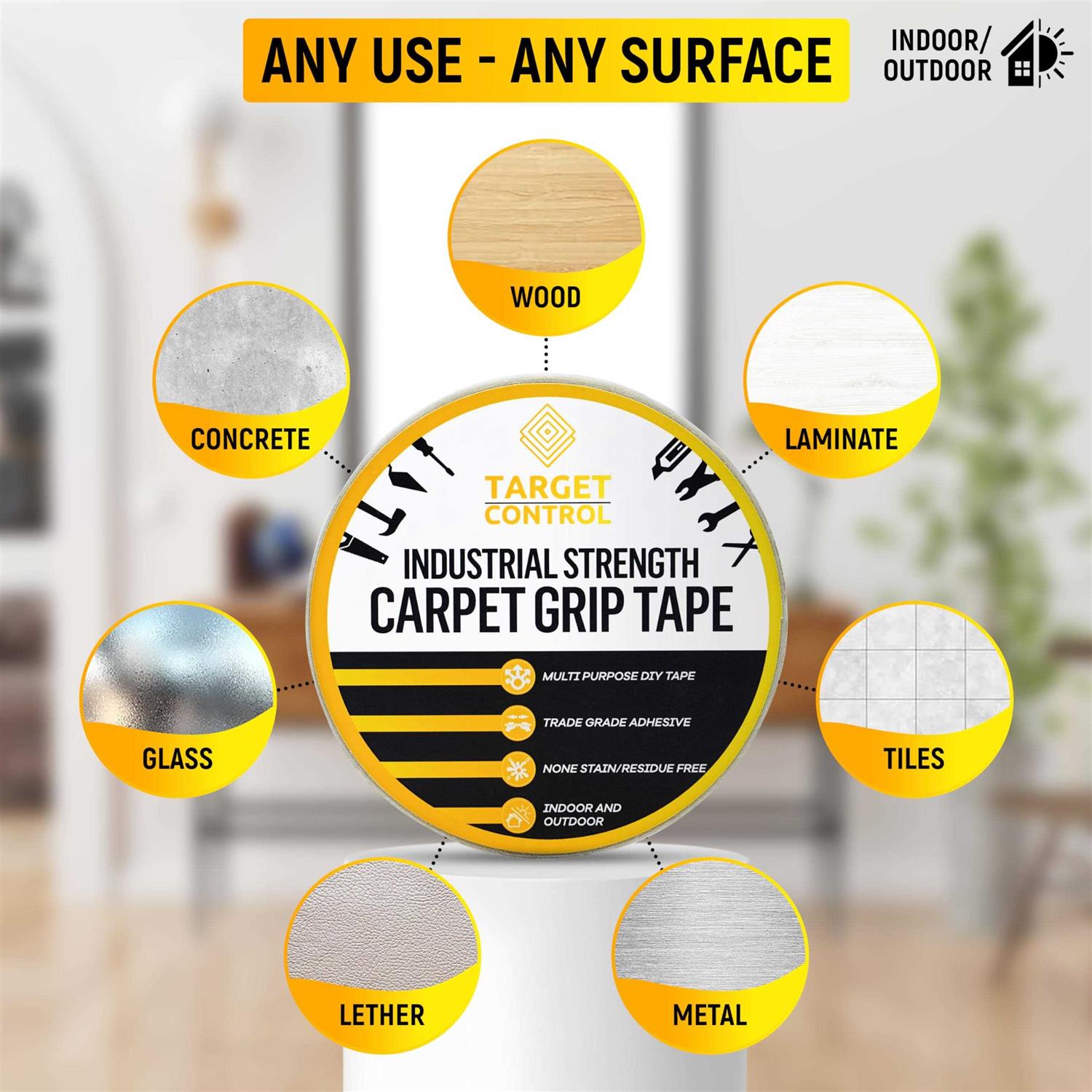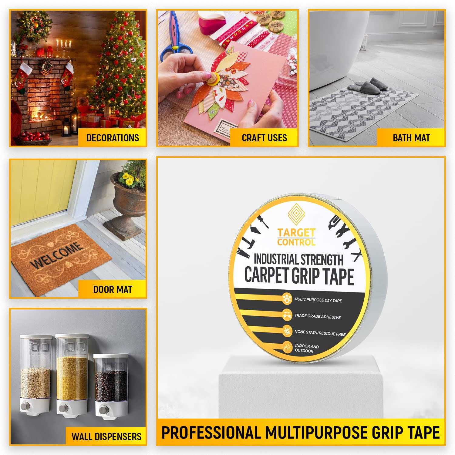 Carpet Tape Double Sided Our Strong Rug Tape For Area Rugs On Tile The Carpet Tape For Tile Floors Are Used For Hard Surfaces Only & NOT Rug to Carpet. Multi Purpose Target Control’s Double Sided Tape For Rugs, Are Widely Used On Outdoor Carpet Tape, Rug Gripper Tape, Carpet Adhesive, Outdoor Rug Tape For Concrete, Tiles, Wooden Floors ETC. No Residue Left Our Unique Is Made With A Clear Solution And Does Not Leave Any Marks When You Remove It, Our Double Sided Rug Tape Are Extremely Heavy Duty & Is Designed To Non Stain, Easily Remove The Tape Without It Leaving Any Residue Or Trace Of Sticky Adhesive That Can Damage Your Floor (IMPORTANT: DO NOT USE ON CARPET THIS IS FOR HARD SURFACES ONLY). This Product, Like Any Strong Double Sided Tape, Is Not To Be Used On Top Of A Carpet – Only To Tape To Floorboards Etc. Extra Safety Target Control Extra Strong Double Sided Tape Is Just As Good As Carpet Glue Adhesive. Professional Use This Double Tape Is Used By Many Professionals As Carpet Binding Tape, Carpet Tape For Rugs On Top Of Flooring, Double Sided Tape For Carpets, Carpet Grip, Carpet Joining Tape, Carpet Edging Tape, Carpet Tacks For Stairs.