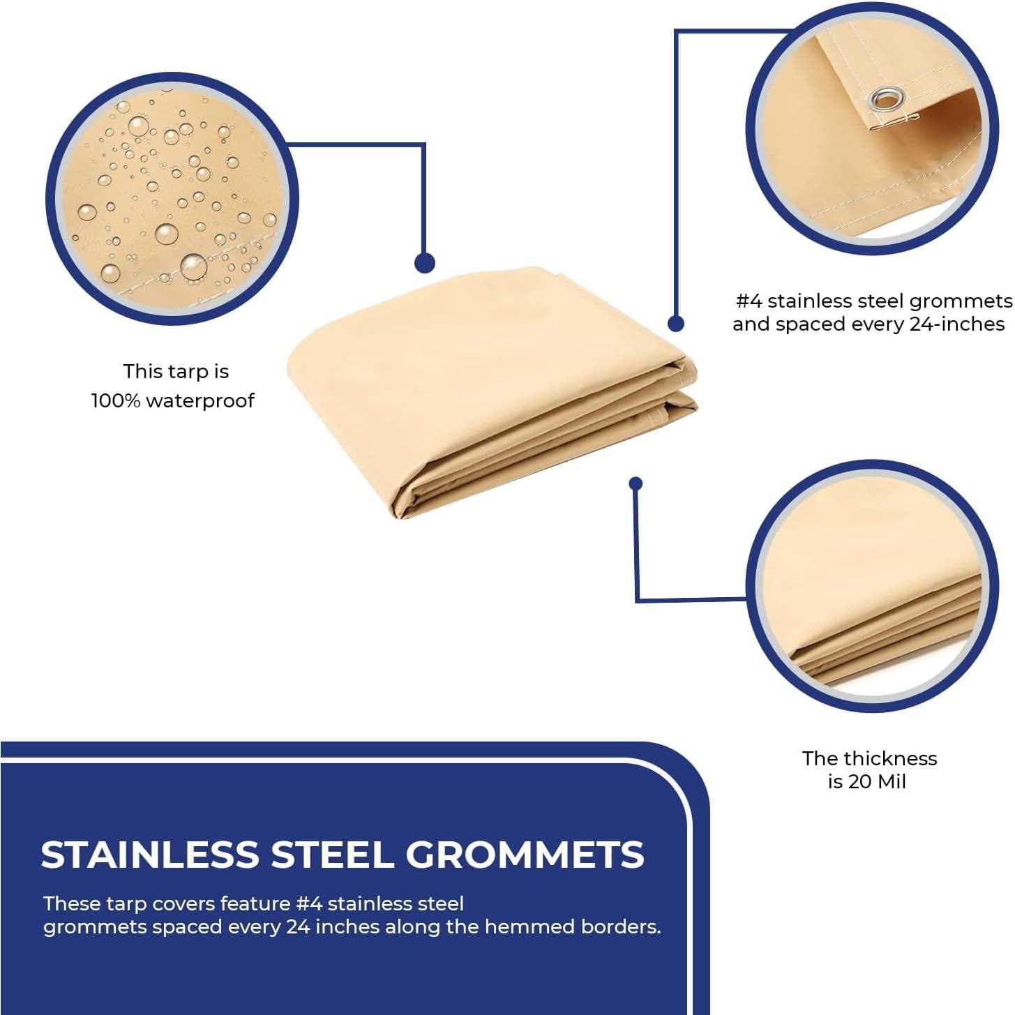 The Tarps Now heavy duty 18oz Vinyl Tarps are durable and strong that is 100% waterproof, tough enough for messy, complicated jobs. This tarp is UV-resistant, tears, abrasion, puncture-free, and wont be torn easily. Our Tarps are ideal for all kinds of indoor and outdoor activities. WATERPROOF VINYL TARPS: Tarps Now tarp is crafted from heavy-duty vinyl-coated PVC material which is 100% waterproof, incredibly strong, and durable. PERFECT FOR ALL WEATHER: Our vinyl tarps are capable of withstanding tough weather conditions to remain flexible even under harsh arctic temperatures. COLOR AND WEIGHT: The size of this vinyl tarp is 8′ X 20′. The thickness is 20 Mil and the finished fabric’s weight is 18oz. The color is Tan. #4 RUSTPROOF EYELET: This tarp cover comes with #4 stainless steel grommets and is spaced approx. every 24 inch for solid and reliable tie-down purposes. VERSATILE USES: Our Tarpaulin cover is great for trucking, industrial, equipment, commercial, storage, and agricultural applications. You can create a tent for camping, fairs, and more outdoor activities with the Tarps Now tarp cover sheet. It is manufactured with triple-thick reinforced hems sewn and durable heat-welded seams around the perimeter with sturdy polyester. Comes with rustproof grommets that won’t snap or buckle when securing even the most cumbersome loads. Please Note: This 18oz vinyl Tan Tarps are finished size (+/- 2 inch tolerances)