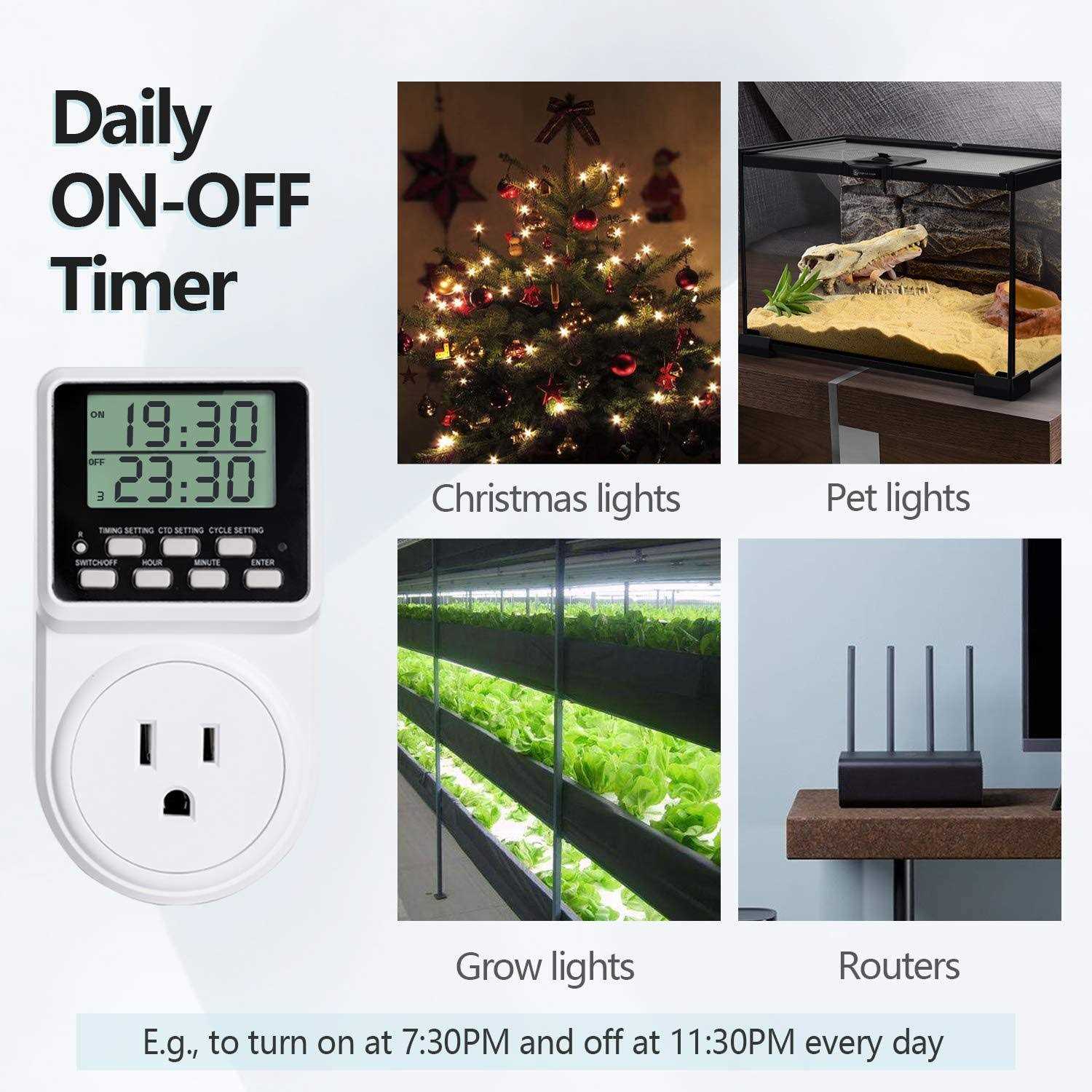 - Featuring 3 core functions: daily on-off timer, countdown and turn on/off timer, short on-off cycle timer.