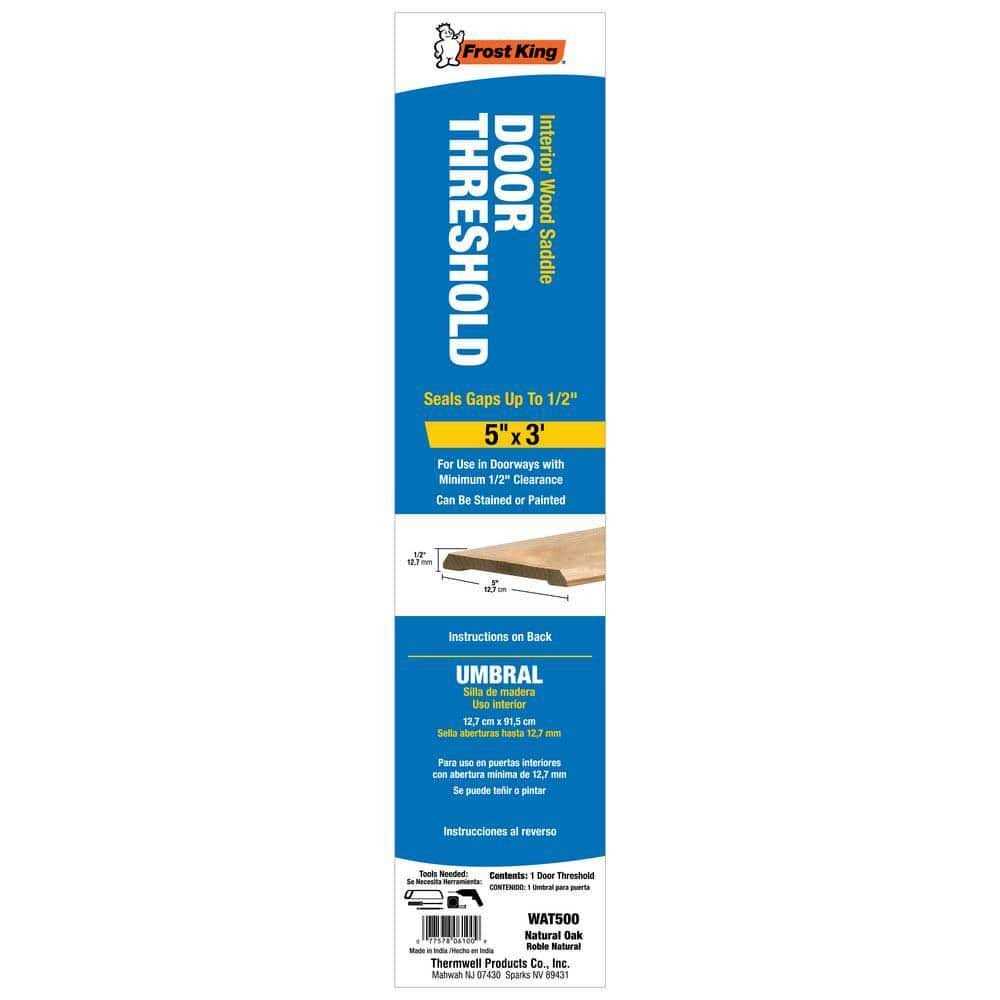 Frost King door threshold come in both residential and commercial grades and also in a variety of finishes. Aluminium and oak available. This is a 5 in. X 1/2 in. Wood threshold for interior doors. It is designed to cover and hide wood and carpet seams on the interior of doorways. The threshold has a low profile to prevent tripping and is constructed of oak. The extra wide threshold can be painted or stained to match your existing woodwork.