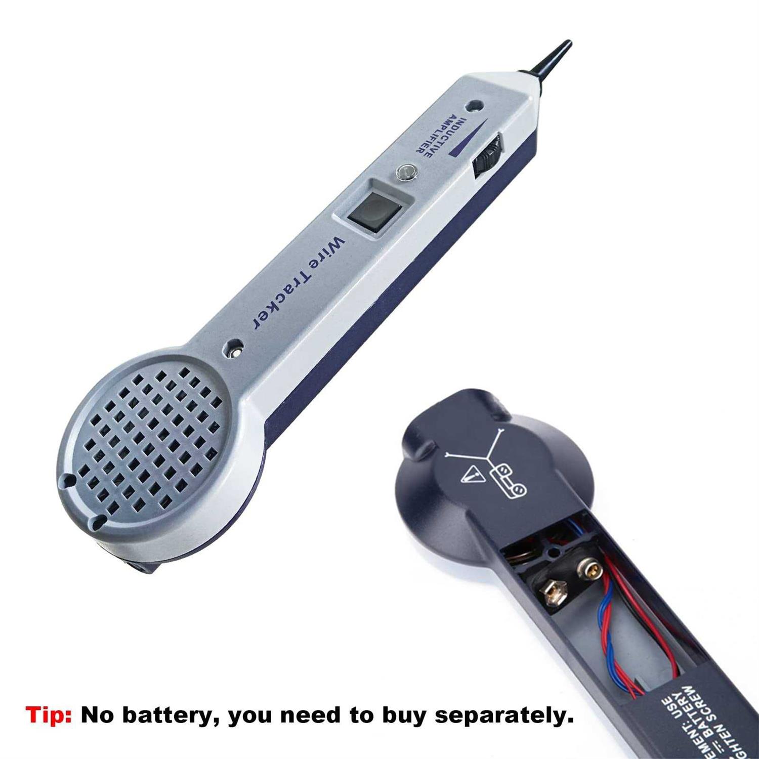 【High Quality】This tone generator and probe kit is made of high-quality materials, wear-resistant, and corrosion-resistant. The gain is normal 30dB, the input impedance is nominal 100M Ohm. Note: the wire tracker needs two 9V batteries(NOT INCLUDED). 【Accurate & Easy】With an optional continuous or adjustable generator, the method is simple and the test results are accurate. One-button operation. Clip and trace, 1 second to identify cables. Convenient to carry and store the tester with a carrying bag, and protect it from damage, makes it durable. 【Powerful & Professional】When used in conjunction with any tone generator, a professional wire toner probe kit with adjustable volume is designed to identify and trace wires or cables within a group without damaging the insulation. For non-terminal cables, clamp mode can be used for direct measurement, as well as for telephone and network line measurement. 【Safety in Use】Circuit tester has a spring-loaded ON/OFF button; adjustable volume sensitivity control; recessed terminal ports for handset connection; resistive plastic carbon-fiber tip prevents accidental shorts when probing wires. The insulation probe and built-in loudspeaker can effectively avoid short circuits of the conductor and make it safer to use. 【Widely Application】This wire tracker is widely used in the maintenance of cables and wires. The measurement area includes line tracking, short circuit test, and clear/busy/ringing identification. Selectable continuous or variable tone generator. Specification Br Material: Plastic Br Rated Gain: 30dB Br Input Impedance: 100m ohm nominal Br Metal Tip: 0 ohms Br Plastic Tip: 300 ohms Br Battery: 1x9v DC battery (NEDA 1604, JIS 006P or IEC 6LR61) (battery not included) Br Battery Life (Nominal): 50 hours Br Temperature Celsius: 0°C – 50°C Br Fahrenheit: 32°F-122°F Br Weight: Approx. 300g/10.6oz Br Size: Approx. 231x55x28mm / 9.1×2.2×1.1in Br Br Packing List: Br 1 X Storage Bag Br 1 X Tester Cable (2 Parts) (Battery Not Included) Br 1 X User Manual Br 1 X Head Replacement Br
