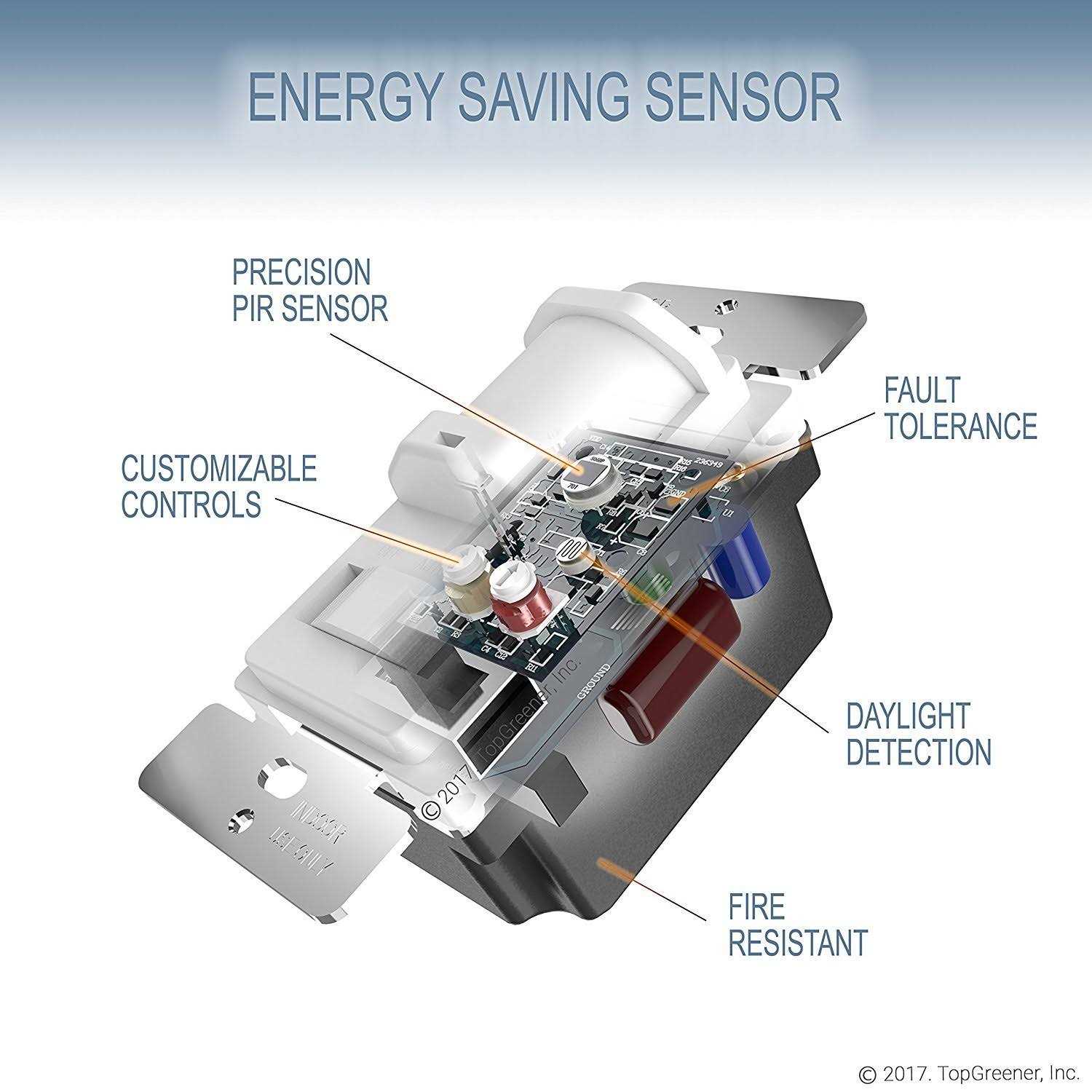TOPGREENER TSOS5-W Passive Infrared In-Wall Motion Sensor Light Switch, you can enjoy great savings and convenience with lighting control. When you put the slide switch button to AUTO mode, TSOS5 PIR motion sensor will detect motion and turn on load such as a lights, fans, motors, or heaters automatically; and turn off the load when no motion is sensed for preset delay time. Variable delay time between 15 seconds, 10 minutes, 20 minutes and 30 minutes. Passive Infrared, PIR sensor detect occupancy by sensing the difference between heat emitted from the human body in motion and background space. This occupancy sensor has a maximum coverage area up to 980 sq. ft, 150-degree field of view; sensitivity level is adjustable in 4 positions from 30% to 100%. To provide adequate coverage with-in a space, motion activated sensors utilize a unique Fresnel lens which divides the coverage area into zones, thus enhancing the detection of small movement.With Top Greener’s TSOS5 in-wall motion sensor light switch, you will enjoy the energy efficient benefits and avoid energy waste by preventing lights to turn on in the day time even when motion is detected. Use the TSOS5 as occupancy motion detector sensor, or set it to be in manual OFF or ON mode just like your standard ON/OFF.This operation can be done easily by sliding the sliding switch on the front of the motion sensor. TOPGREENER’s TSOS5 motion sensor light switch is perfect for areas like your hallway, stairway, closet, bathroom garage, and more! Specifications: Incandescent: 500-Watt @ 120 VAC Fluorescent: 500-Volt Amp @ 120 VAC Motor: 1/8HP @ 120 VAC Coverage: 150 degrees, 450 square feet Single-Pole use only Neutral wire required