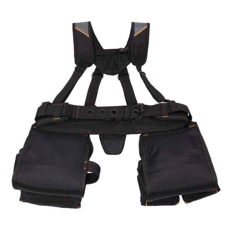 The Pro Carpenter Suspension Rig is built for the professional. Its innovative structure has plastic-walled pockets that won’t collapse forward, keeping tools from falling out. The pouches stay wide open making your tools easier to see, easier to access. Supremely comfortable padded belt and suspenders comfortably distribute heavy loads for all day comfort. The rig offers a 2 hammer loops, tape-measure holder and more.