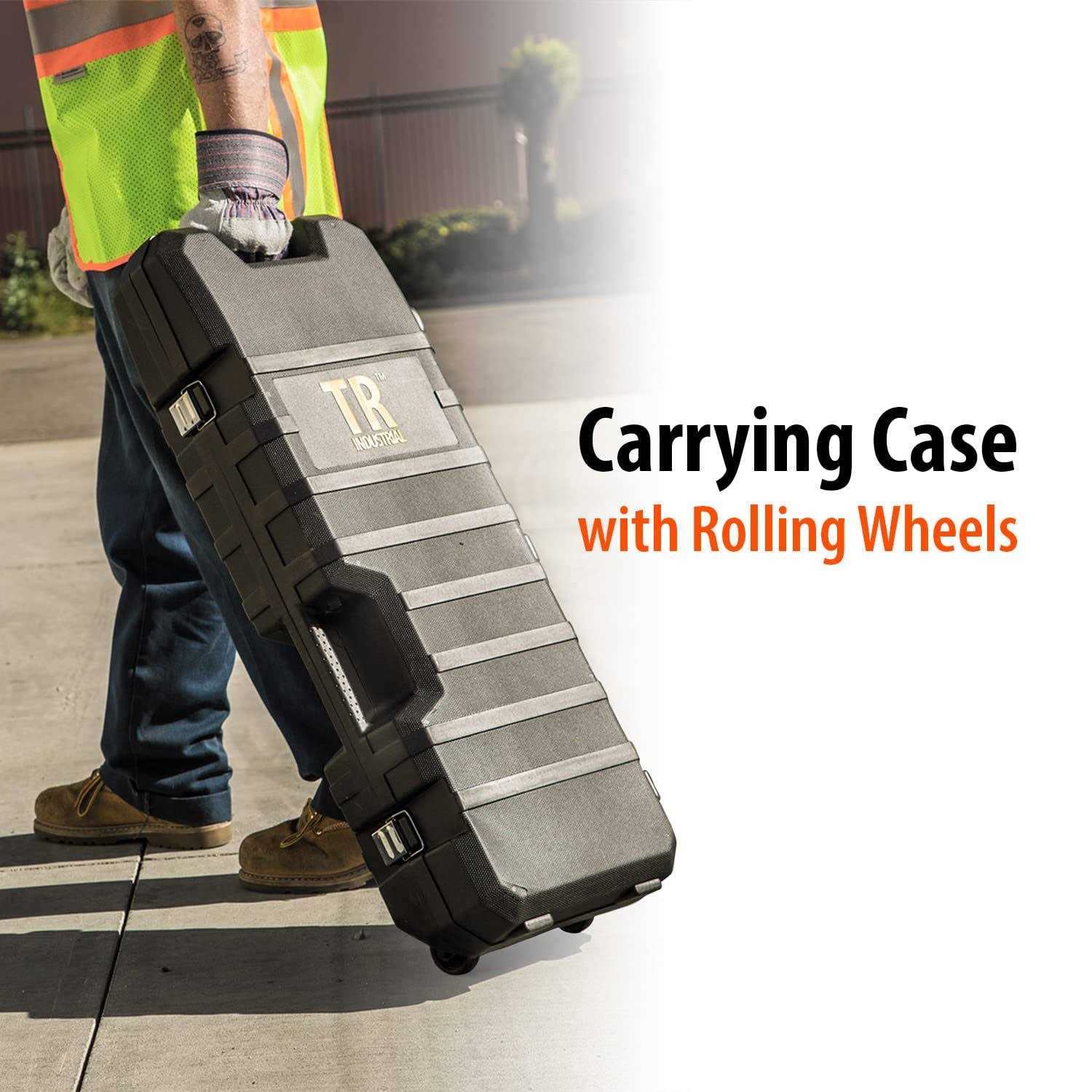 Demolition Jackhammer (TR89305) by TR Industrial. The all new TR-300 series jackhammer by TR Industrial brings you more power and speed. The demolition hammer delivers an exceptional 60 Joules (44.2 ft-lbs) of impact energy while weights only 35 lbs. Its high-strength modulus gear delivers longer life. With all metal housing and barrel, this jackhammer is built for heavy-duty applications. With unparalleled 1800 BPM (blows-per-minute), the ultra fast demolition helps your get the job done faster. The demolition jack hammer comes standard with (1) bull-point and (1) flat chisel, a pair of premium tough work-gloves and a custom fitting molded case with wheels for easy transport. TR Industrial also offers other accessories for the TR-300 series demolition hammer for your need, additional accessories sold separately.