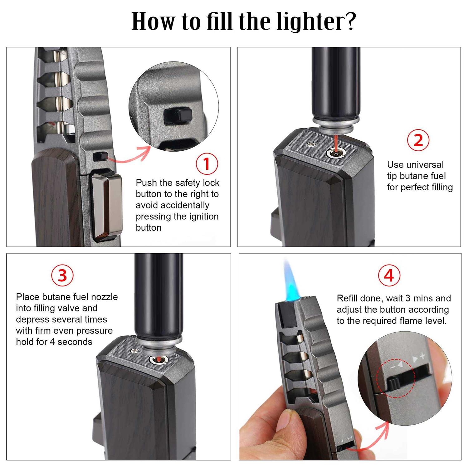 About The Item: High-quality Turbine Torchertorch Lighter With Metallic Texture Is Made Of High-quality Zinc Alloy. The Slim, Lightweight, And Stylish Body Design Is Easy To Put In Your Pocket And Carry. Refillable & Adjustable Three Levels Of Flamethe Butane Torch Lighter Can Refill Butane When Out Of Gas, Compared With The Light That Will Be Discarded When The Fuel Is Used Up, It Is More Energy-saving And Environmentally Friendly. Ultra-powerful Blue Flame With 3 Levels Of Adjustable Flame In.
