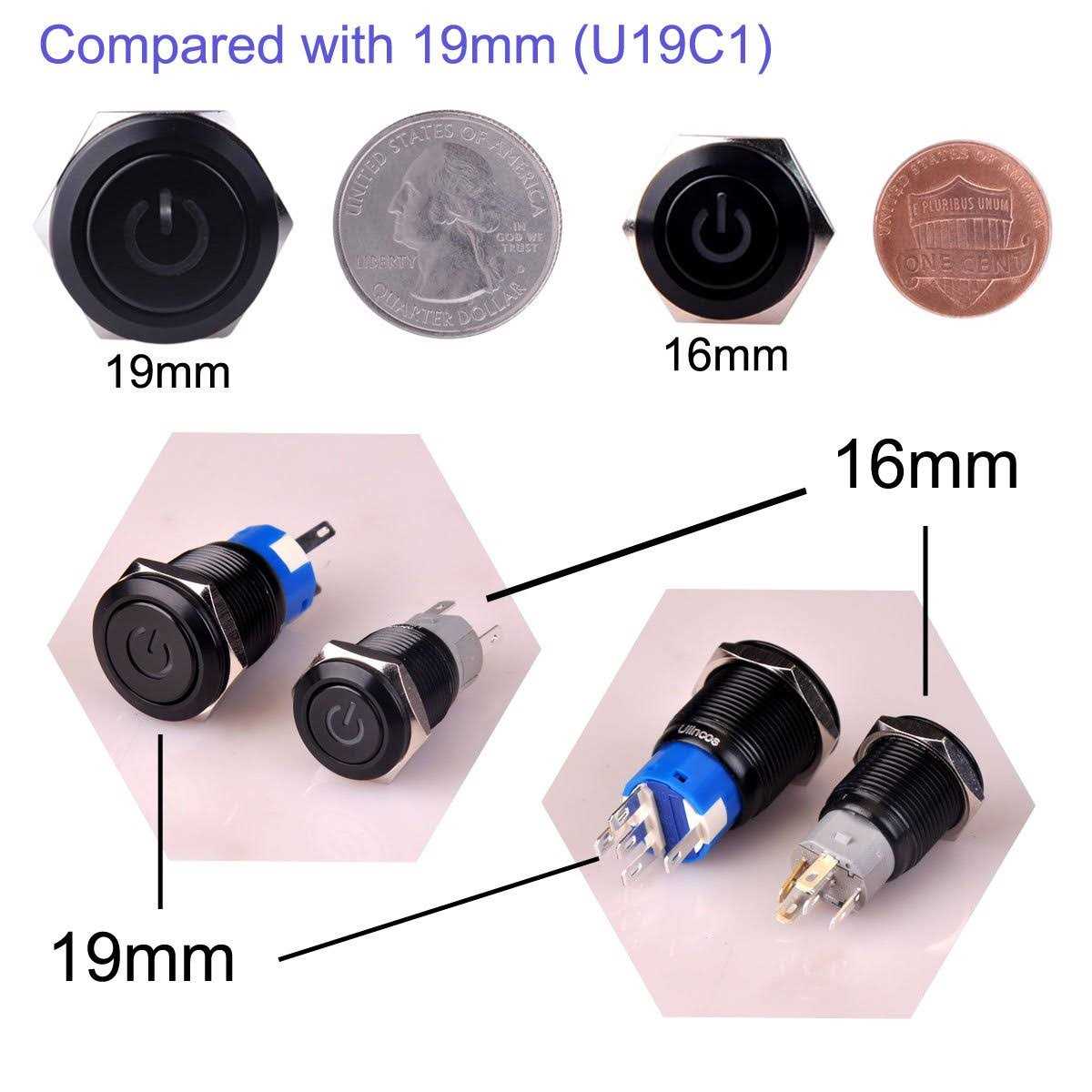 Pushbutton Switches by Ulincos. Details:What You Get: 1 * pushbutton switch 1 * wiring instruction What’s the Pushbutton Switch: This is a perfect choice if you are in need of a rugged push button! These metal push buttons are a very tough, small, panel-mount latching switch with an illuminated green power symbol LED. It is a SPDT with 16mm threading and 1mm pitch. This button is perfect for basic On/Off functions. Overall length (including leads) is 1.3″ and has small solder lugs for connection. These latched buttons are rated up to 5A and 250VAC while the LED is rated for 5-12V. What’s the Latching Switch: Latching switch, push it down, it stays down and latched in the closed position, press the button again and it releases and “unlatches”. What’s the Latching Switch Used for: Most often latching switches are used for various additional electric equipment inside & outside the car.( Such as critical lights, chassis lamp, fog lamps, dome light) What’s Note: * These switches come…