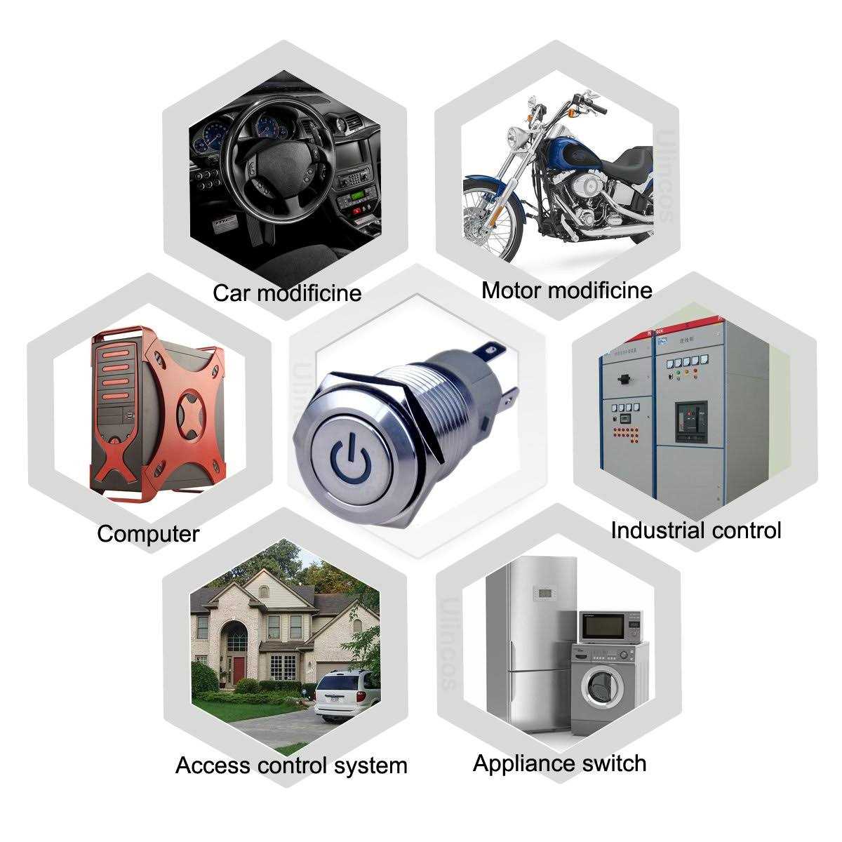 Pushbutton Switches by Ulincos. Details:What You Get: 1 * pushbutton switch 1 * wiring instruction What’s the Pushbutton Switch: This is a perfect choice if you are in need of a rugged push button! These metal push buttons are a very tough, small, panel-mount latching switch with an illuminated blue power symbol LED. It is a SPDT with 16mm threading and 1mm pitch. This button is perfect for basic On/Off functions. Overall length (including leads) is 1.3″ and has small solder lugs for connection. These latched buttons are rated up to 5A and 250VAC while the LED is rated for 5-12V. What’s the Latching Switch: Latching switch, push it down, it stays down and latched in the closed position, press the button again and it releases and “unlatches”. What’s the Latching Switch Used for: Most often latching switches are used for various additional electric equipment inside & outside the car.( Such as critical lights, chassis lamp, fog lamps, dome light) What’s Note: * These switches come…