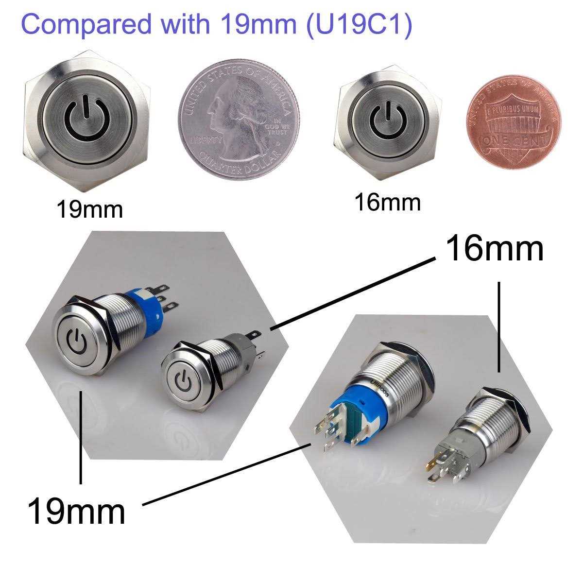 Ulincos Latching Push Button Switch U16F5 1NO1NC SPDT On/Off Silver Stainless Steel Shell with Blue Power Symbol LED Suitable for 16mm 5/8″ Mounting