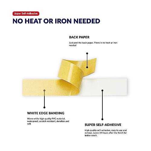 HIGH QUALITY FLEXIBLE PVC TRIM – This trim is durable and long-lasting. Made to cover the edges of furniture, shelves, machines and general DIY projects, this edge trim can be applied with a roller or a wood block for a perfect bond to any type of surface PEEL AND STICK WHITE PVC EDGE BANDING – Self-stick edging is easier than standard pre-glued edge bandings. Offers very short application time and has an incredibly strong adhesive. Just peel, stick and give it a pass with a roller to push the adhesive into the mdf, plywood or particleboard and all done. There is no heat or ıron required