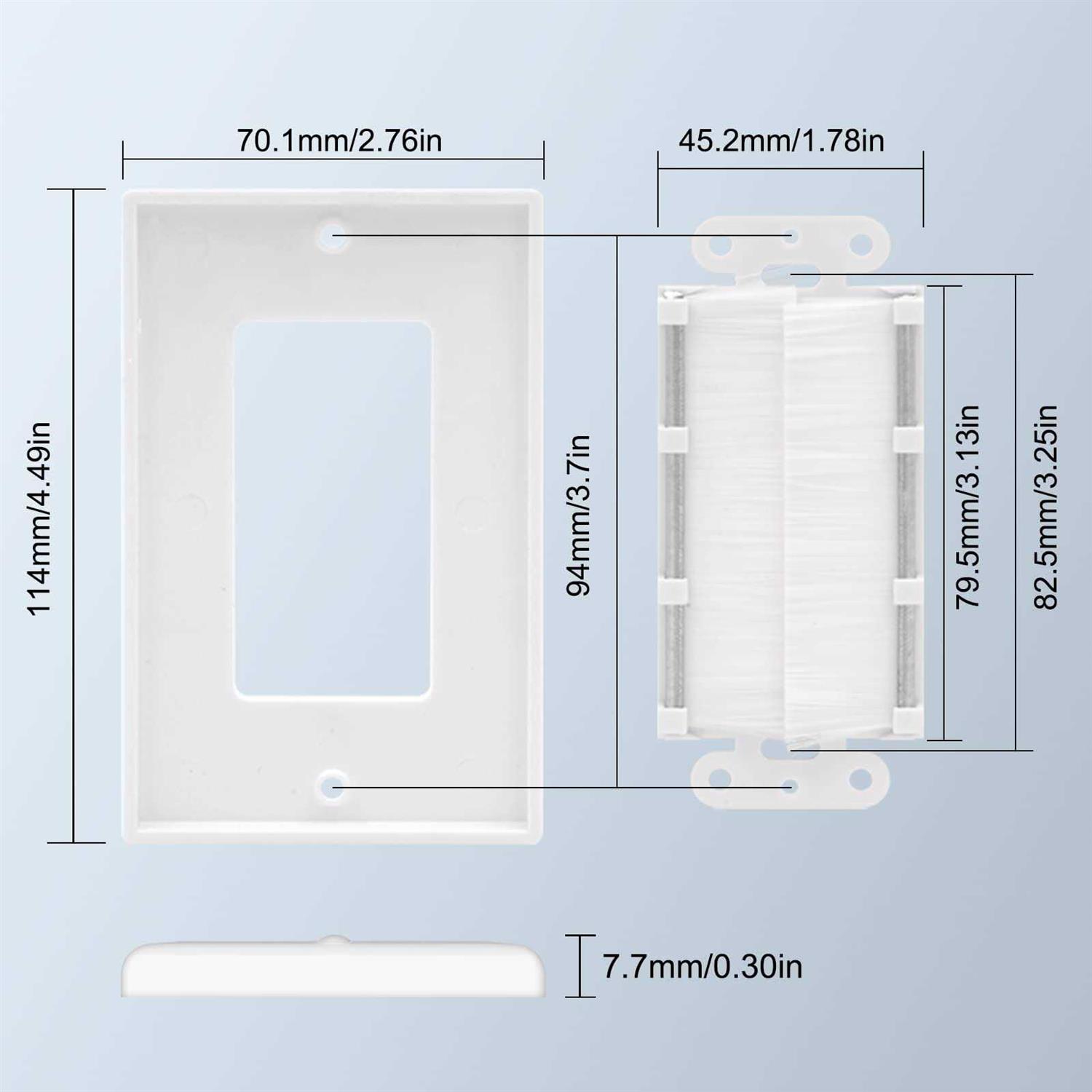 VCE standard size Brush Wall Plate. Equipped with mounting screws and very easy to set up allows you to quickly easily clean cable access from any wall in your home directly to your cable. Works perfect with HDMI cables coax cables speaker wires standard AV audio video cables network/phone cables and more. It runs cables neatly through walls. With UL Listed, just use it without concern. Smooth and clean HDTV Installations, perfect for HDTV cables and home theater installations. Easy set up, Installs in just minutes, Insert the brush into the outer casing and place on the wall. Run your cables cleanly and neatly through the wall,the package is equipped with mounting screws.