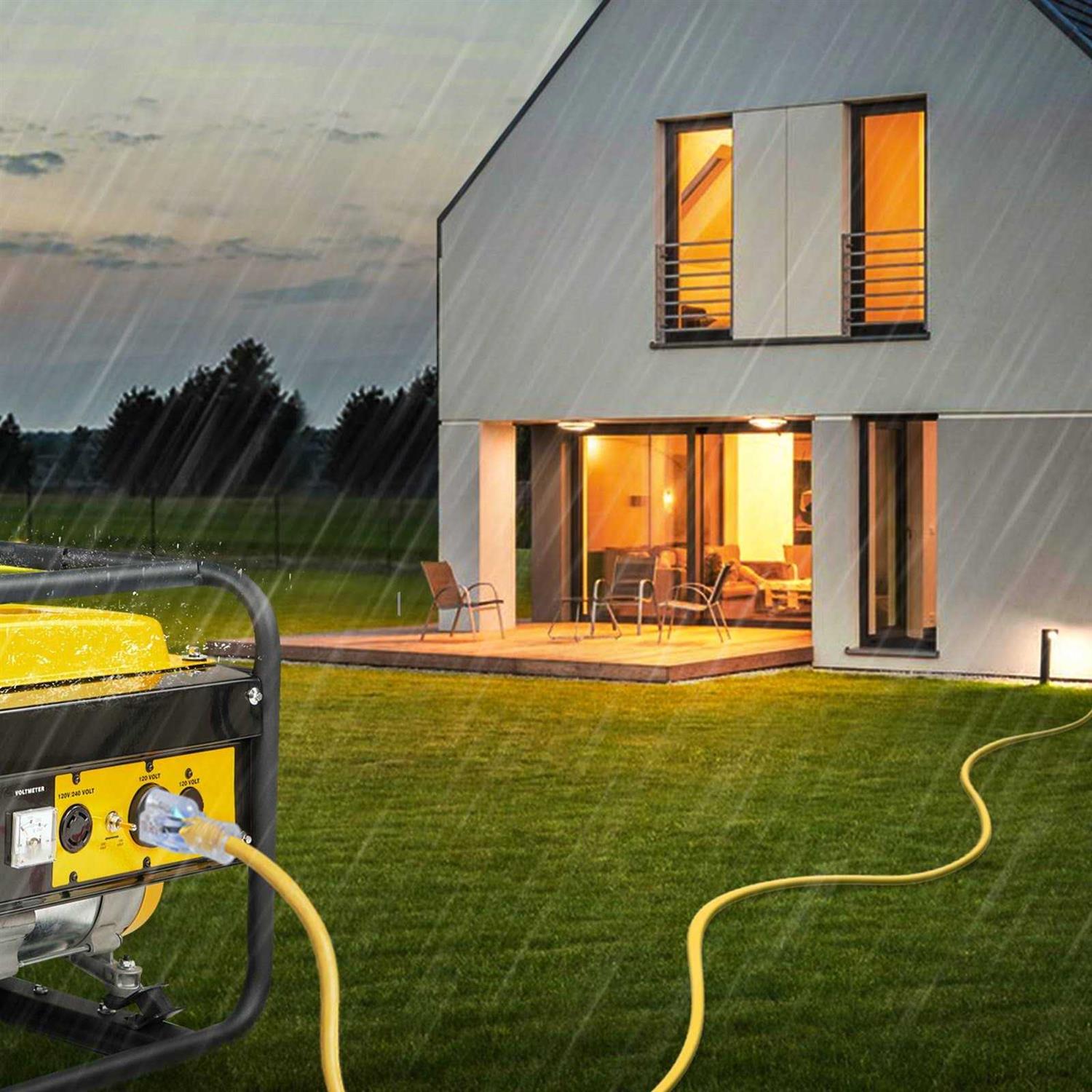 Max. Load 1875W: Our generator extension cord supports loads up to 1875W (125V/15A). 100% all-copper cable conducts electricity faster and more consistently for heavy-duty power tools such as circular saws and grinders. Strong Weather Resistance: The 25-foot generator power cord is both functional and practical. The thickened PVC-wrapped surface is waterproof, wear-resistant, and can be exposed to sunlight for a long time. Remains flexible and works uninterrupted in extreme climates ranging from-40°C to 158°C. Clear LED Indicator: The female end of the heavy-duty generator extension cord is equipped with an LED indicator to show the power on condition at a glance. The eye-catching yellow color makes it easy to find even at night, significantly reducing the risk of touching in the dark. ETL Security Certification: The generator electric cord is ETL certified, and you can use it with confidence. The generator cable has passed the bending test and 2500V high voltage test before shipment to ensure you can use it securely after receiving it. Designed for Generators: The 25-foot long heavy duty outdoor extension cord with 15A NEMA 5-15P male plug and 15A NEMA 5-15R female plug provides you with a more convenient power supply over long distances, whether for home or outdoor use.