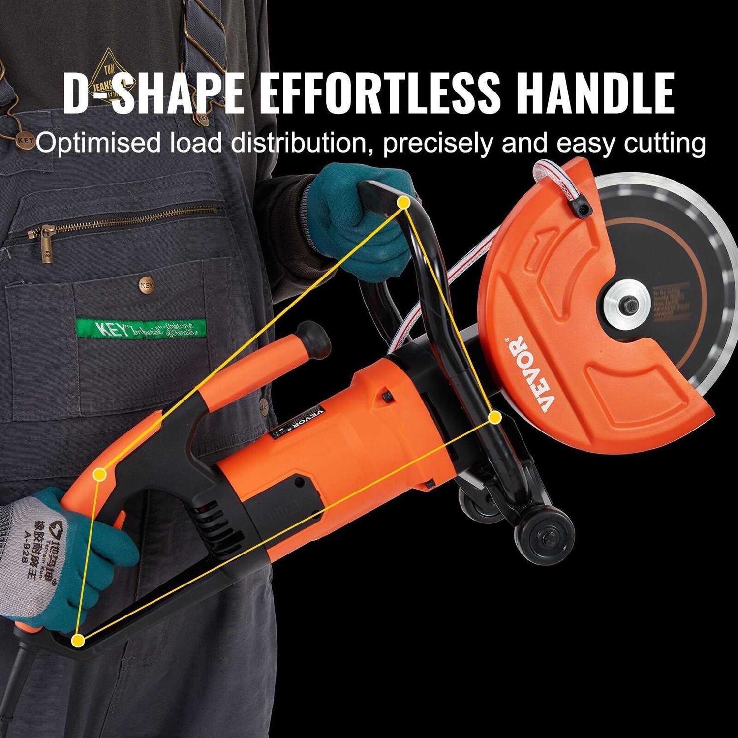 Wet Cutting without Dirt: VEVOR electric concrete saw provides a better cutting vision and less lung damage by avoiding the debris that spreads around in traditional cutting operations. Plus, it comes with a wet-cutting attachment, ensuring direct water spraying, eliminating the need for one-handed watering and cutting, and improving operational security. High-efficient Working: Supporting with 1800 W strong power, the concrete saw cutter features a fast 5800 rpm speed, achieving efficient slotting and fast, plat, and stable cutting. Also, its 15A pure copper motor is heat-poof and will never be burned. Secure Operation: The double switch prevents accidental activation when the concrete saw is not in use, which can keep you from injury. In addition, the slow start, overload protection, and the built-in GFCI design allow the machine to run more smoothly and safely, extending its life. Convenient to Use: The concrete cutter has a wheeled base acting as a cutting and positioning device for more precise and effortless grooving. The sizeable D-shaped handle is ergonomically designed for a comfortable grip and long working hours. Fit for Multiple Materials: This Concrete Cutter Saw has a 9″ saw blade and cuts up to 3.5″ deep. Suitable for concrete piles such as stone, reinforced concrete, paving and bricks. Attention: Do not press too tightly during operation, as it may trigger overheating protection and cause shutdown