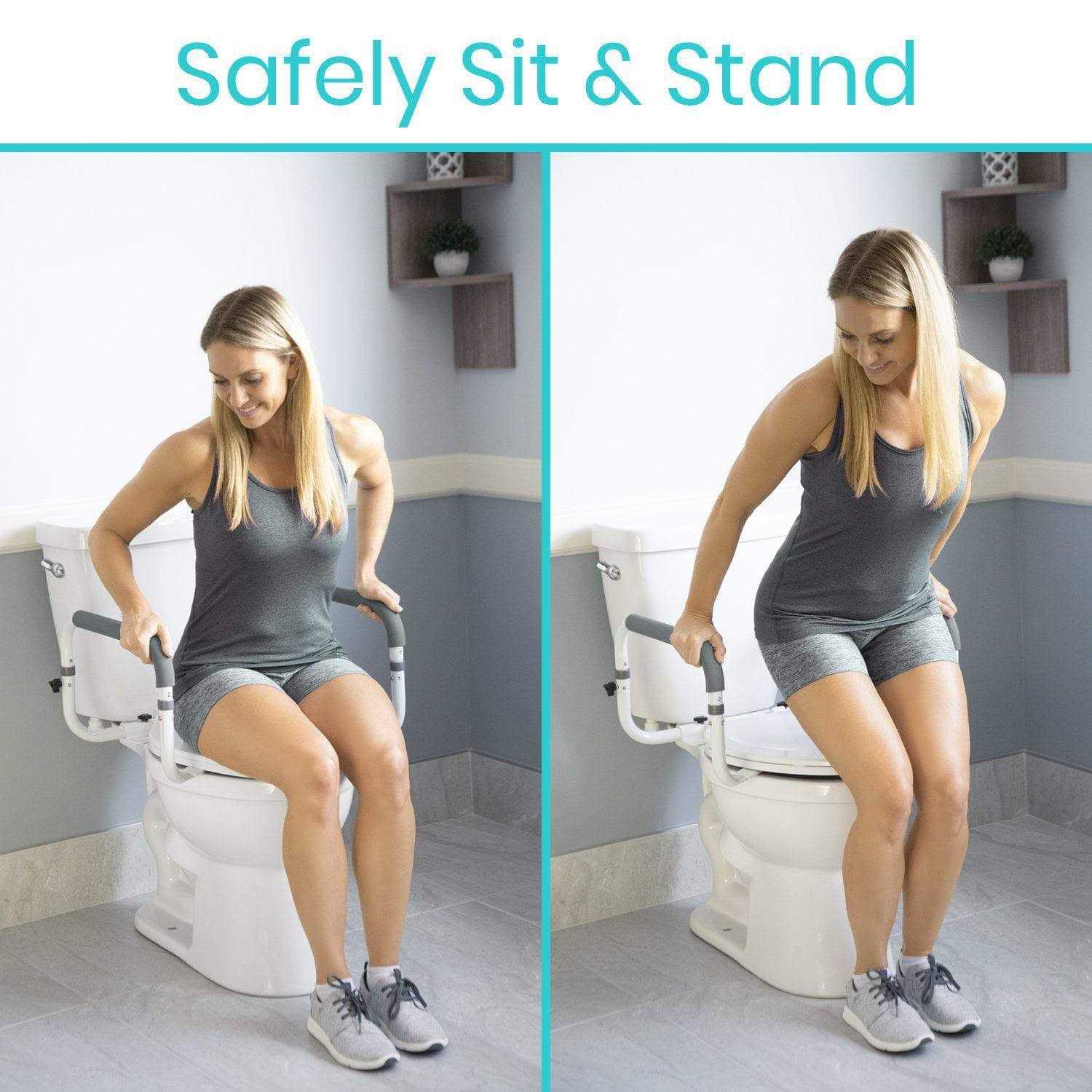 The Vive Compact Toilet Rail is designed to provide additional stability when sitting or rising from the toilet. The toilet safety frame is ideal for those recovering from surgery or injury, those with balance issues and the elderly. The compact toilet safety grab bar can be used with any standard elongated or oval toilet. Rail handles are padded with a soft foam for superior support and easily adjust in width for a customized fit for every household.