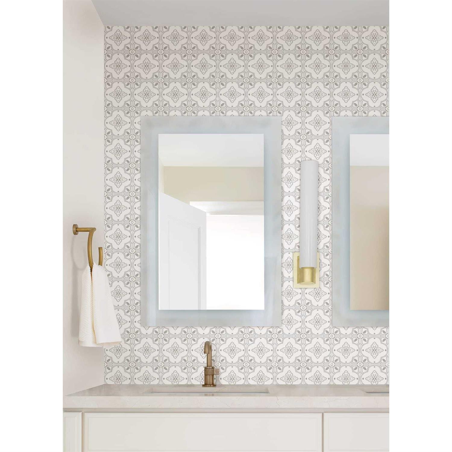 - Taupe backsplash tiles with an elevated, traditional quatrefoil design, made easy to apply with adhesive strips