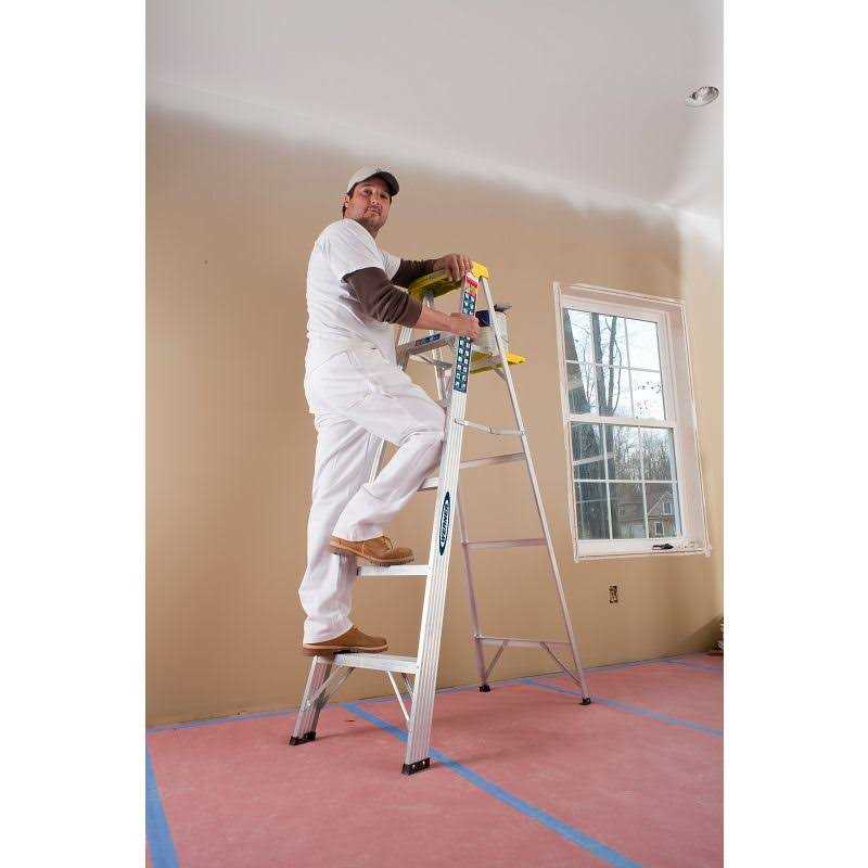 The 366 aluminum 6 ft step ladder has a duty rating of 250 lb and TOOL-TRA-TOP that feature a convenient tray for holding tools or a paint can and slots for a paint roller tray. There is also a sturdy molded paint can hanger on the back of the top. The automatic SPILL-PROOF pail shelf opens and closes with the ladder. The TRACTION-TRED steps are slip-resistant.